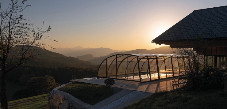 Neben Design sind Funktion und Haltbarkeit wichtig. „Aura steht für Design, leichte Bedienung und hohe Witterungsbeständigkeit“, erklärt Prokurist Michael Doujak. So dient der firmeneigene Schaupark Aura Proof gleichzeitig auch als Prüfstand für die verwendeten Werkstoffe. Denn die Bedingungen am Pool sind hart: Sonne, Wind, Schnee, Chlor und vieles mehr müssen die Überdachungen über Jahre standhalten.