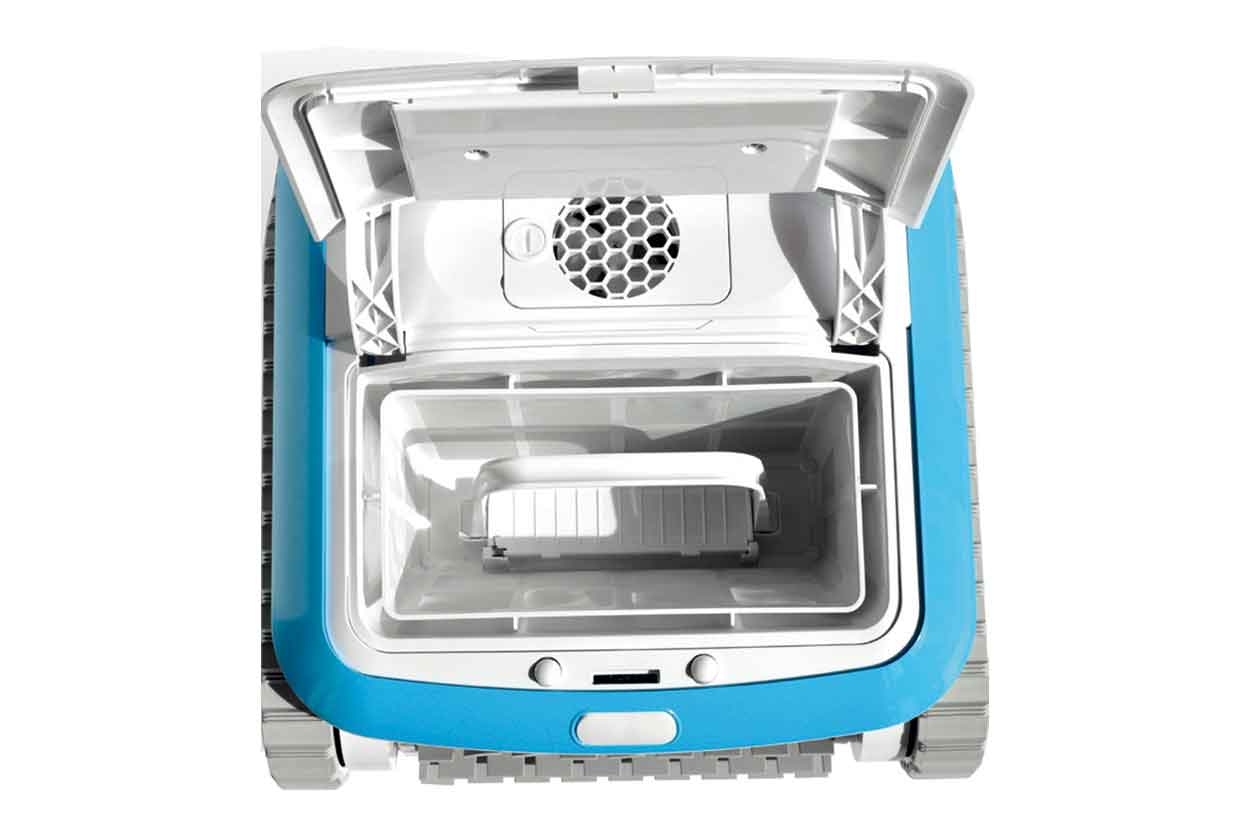 Sie können also Ihren Poolroboter frei mit den Farbtönen Ihres Poolbereichs, den Sonnenschirmen und Liegestühlen kombinieren. Möchten Sie ihn lieber an Ihren Badeanzug oder die Farbe Ihrer Folie anpassen? Auch das ist möglich! Es ist unerheblich welche Art von Becken Sie besitzen – egal ob Folienbecken, Fliesen oder Polyesterpools. Die COSMY Poolroboter sind für jede Form und Größe geeignet. Der Poolroboter fühlt sich auf jedem Boden und jeder Beschichtung wohl. Er manövriert mit Leichtigkeit und passt sich perfekt an alle Konfigurationen an. Seine optimierte Bewegung sorgt für eine einwandfreie Reinigung, unabhängig von der Form des Beckens. Der COSMY ist intuitiv und angenehm zu bedienen. Ein leichter Druck auf eine Taste und schon ist er bei der Arbeit. Eine Kontrollleuchte zeigt Ihnen an, wenn der Filter voll ist und gereinigt werden muss. Mit einem einfachen Knopfdruck wird der Filter von oben gelöst und Sie können ihn bequem und mit sauberen Händen reinigen. Zudem ist der Poolrobtoter sehr klein – dennoch reinigt er mit seiner hochmodernen Konzeption schneller und effizienter und verbraucht dabei weniger Strom. COSMY the Bot gehört zu den saugstärksten Poolrobotern auf dem Markt. Seine Leistung verdoppelt sich bei Bedarf und Sie erhöhen den Unterdruck, indem Sie einfach die Höhe der Düsen verstellen. So passen Sie die Saugkraft an die zu entfernenden Partikel an und selbst die kleinsten Sandkörner, die in das Becken fallen, werden entfernt.