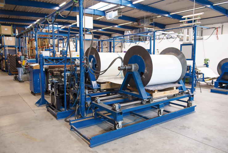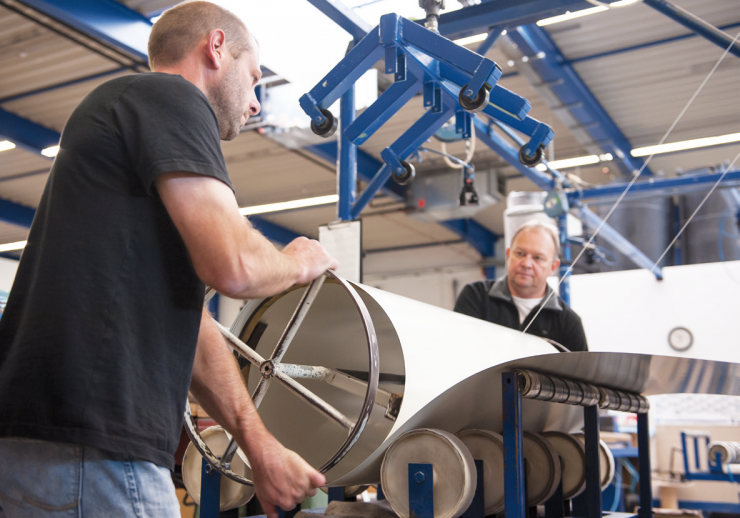 Die erste Station der Produktionsführung sind die Stahl-Coils. Hier wird der Stahl in einer bestimmten Breite, welche der Tiefe des Pools entspricht, von den Stahl-Coils in eine Abwickelvorrichtung pneumatisch und hydraulisch gespannt. Die Enden der Stahlwand werden auf der Abkantbank gefalzt, damit das mitgelieferte Aluminium-Steckprofil die Stahlwand schließen kann. Im Anschluss wird die geforderte Länge eingestellt und der Stahlmantel langsam auf die entsprechende Länge gerollt. Währenddessen werden mithilfe eines viereckigen und runden Stanzwerkzeuges die Löcher für Skimmer und Düse gestanzt. Bei der Stanzung können die Kunden zwischen zwei Alternativen wählen: einem Skimmer und einer Einlaufdüse daneben oder einem Skimmer mit zwei Einlaufdüsen gegenüber. „Welche Stanzung und Variante dabei sinnvoll ist, hängt immer ganz von dem Volumen und der Form des Beckens ab“, erklärt Produktionsleiter Uwe Linke. Die Enden der Stahlwand werden auf der Abkantbank gefalzt, damit das mitgelieferte Aluminium-Steckprofil die Stahlwand schließen kann. Nach Fertigung wird der Stahlmantel für den Versand fertig gemacht. Hier ist darauf zu achten, dass die Transportsicherungen richtig sitzen und dieser immer hochkant transportiert wird.