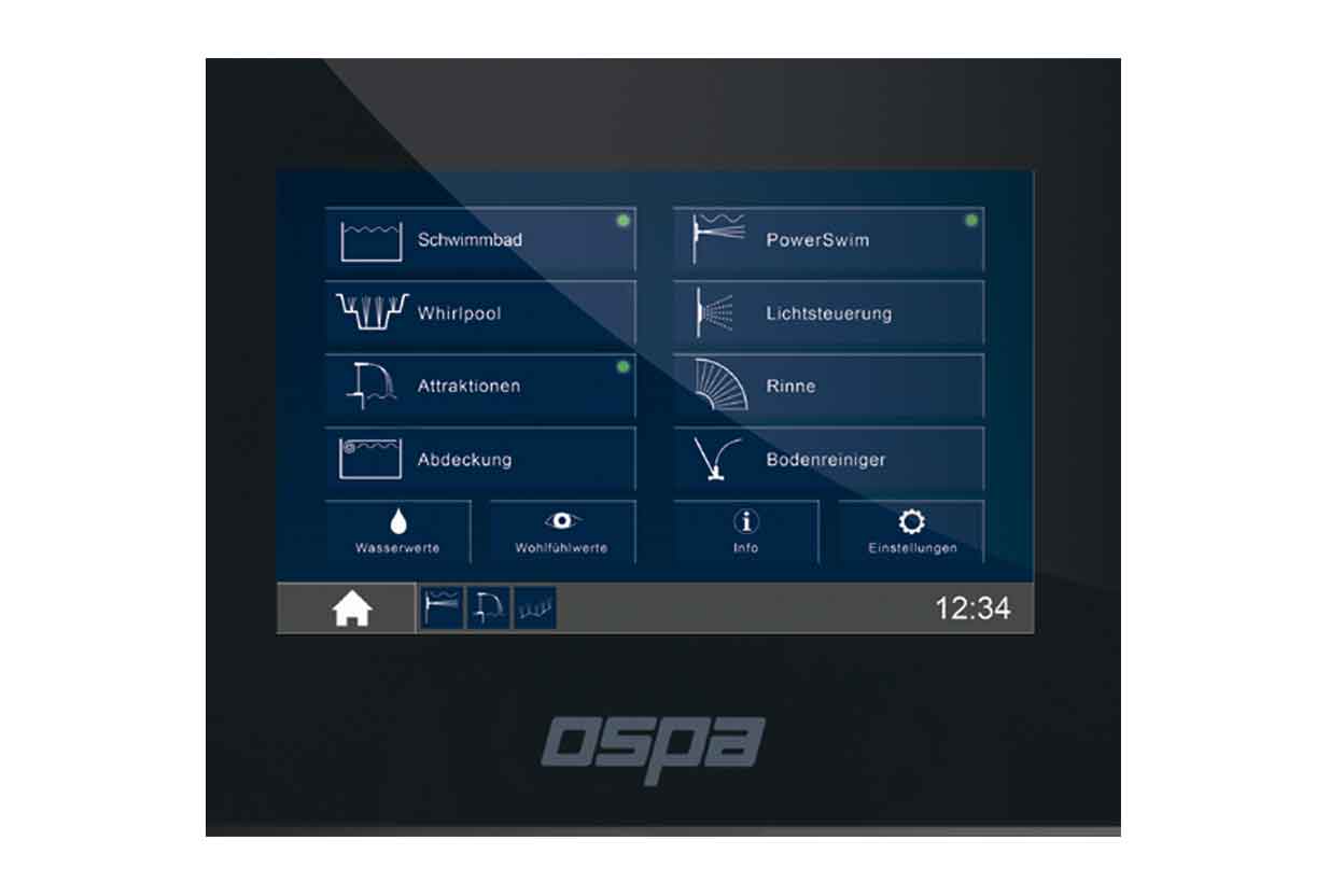 Der intelligente Touchscreen-Computer Ospa- BlueControl 5 Web steuert und überwacht vollautomatisch und präzise alle Funktionen des Schwimmbads. Ob Wasserqualität, Wassertemperatur, Raumklima, Wasserattraktionen oder Beleuchtung – die Ospa-BlueControl 5 Web vereint sämtliche Funktionen in einem Gerät. Damit liegen alle Wasserwerte automatisch im grünen Bereich. Außerdem stellt BlueControl auch den energieeffizientesten Betrieb sicher. Ospa-Blue-Control lässt sich intuitiv über die grafischen Menüs des Touchscreens – auch von unterwegs – bedienen.
