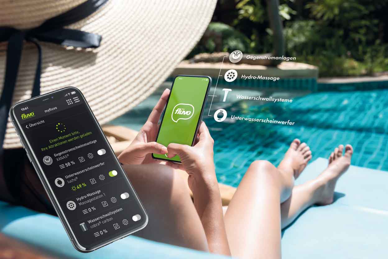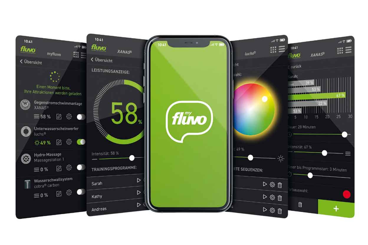 Myfluvo® ist der Inbegriff für den einzigartigen Komfort am Pool und setzt neue Maßstäbe in der intuitiven Bedienung von Schwimmbadattraktionen. Besonderen Wert haben die Entwickler auf die individuelle Ausrichtung gelegt: Alle im Pool installierten Attraktionen können komfortabel ein- und ausgeschaltet werden. Die Intensitäten der Gegenstromschwimmanlage, der Hydro-Massage-Düsen oder der Wasserschwallsysteme lassen sich in der gewünschten Stärke und Dauer einstellen. Die Voreinstellungen für Trainings- und Massageprogramme steigern die Funktionalität und bieten dem Anwender maximalen Komfort seiner fluvo®-Attraktionen.