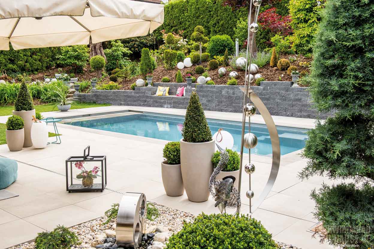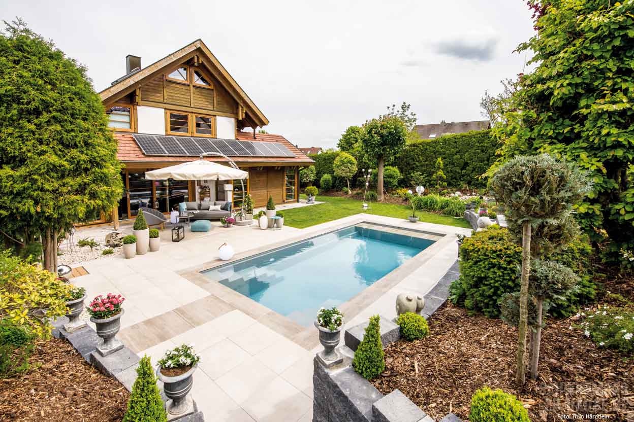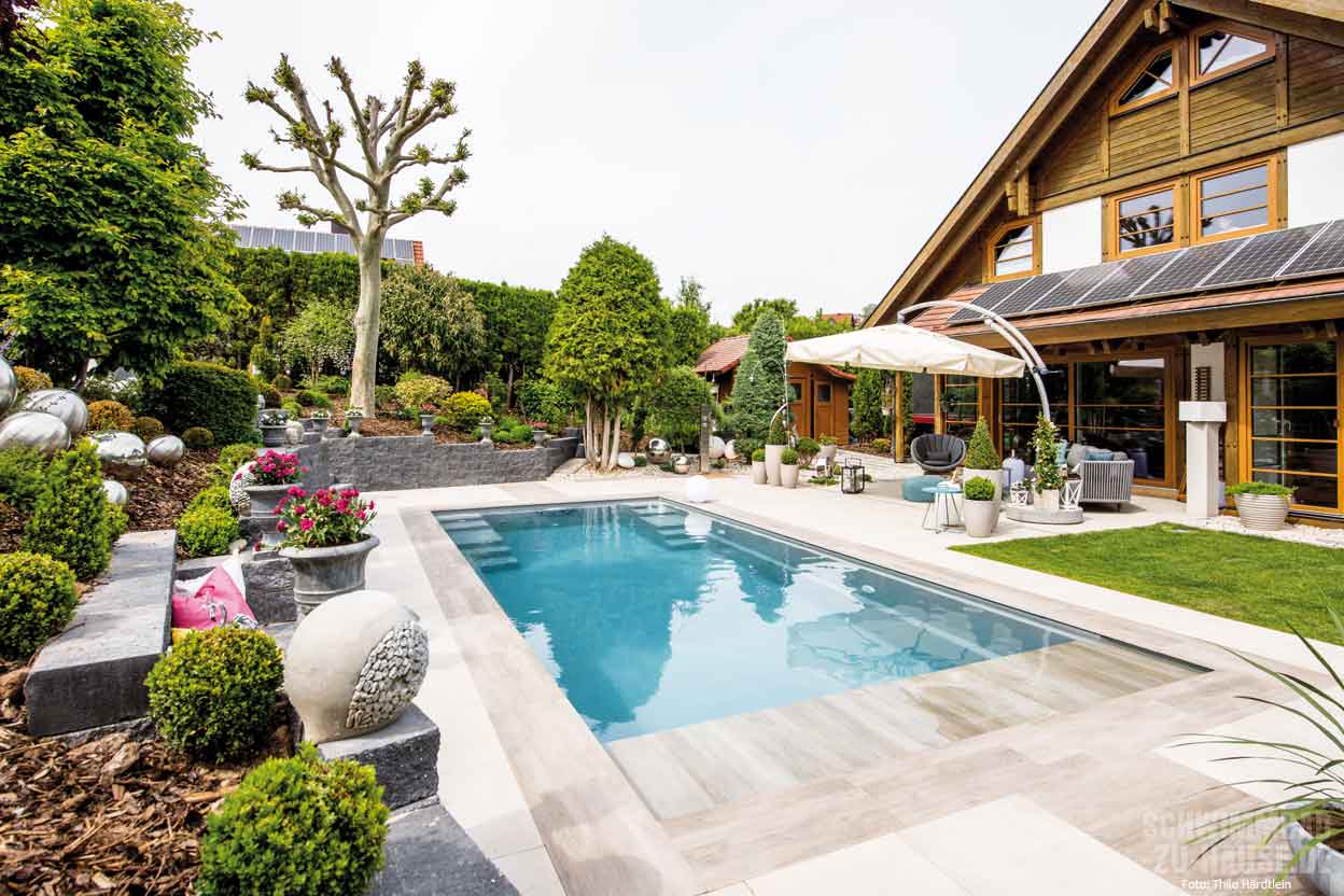 Eigentlich sollte nur die Terrasse neu gestaltet und eventuell ein Wintergarten angebaut werden. Doch dank reiflicher Überlegung, glücklicher Fügung und kooperativer Nachbarn ging schließlich der größte Wunsch der Kinder in Erfüllung: ein eigener Pool im Garten! Und die Eigentümerin dieses schmucken Objekts in Mühlhausen erfreut sich jeden Tag an einer mit viel Liebe zum Detail gestalteten Wellnessoase mit ganz besonderem Flair.