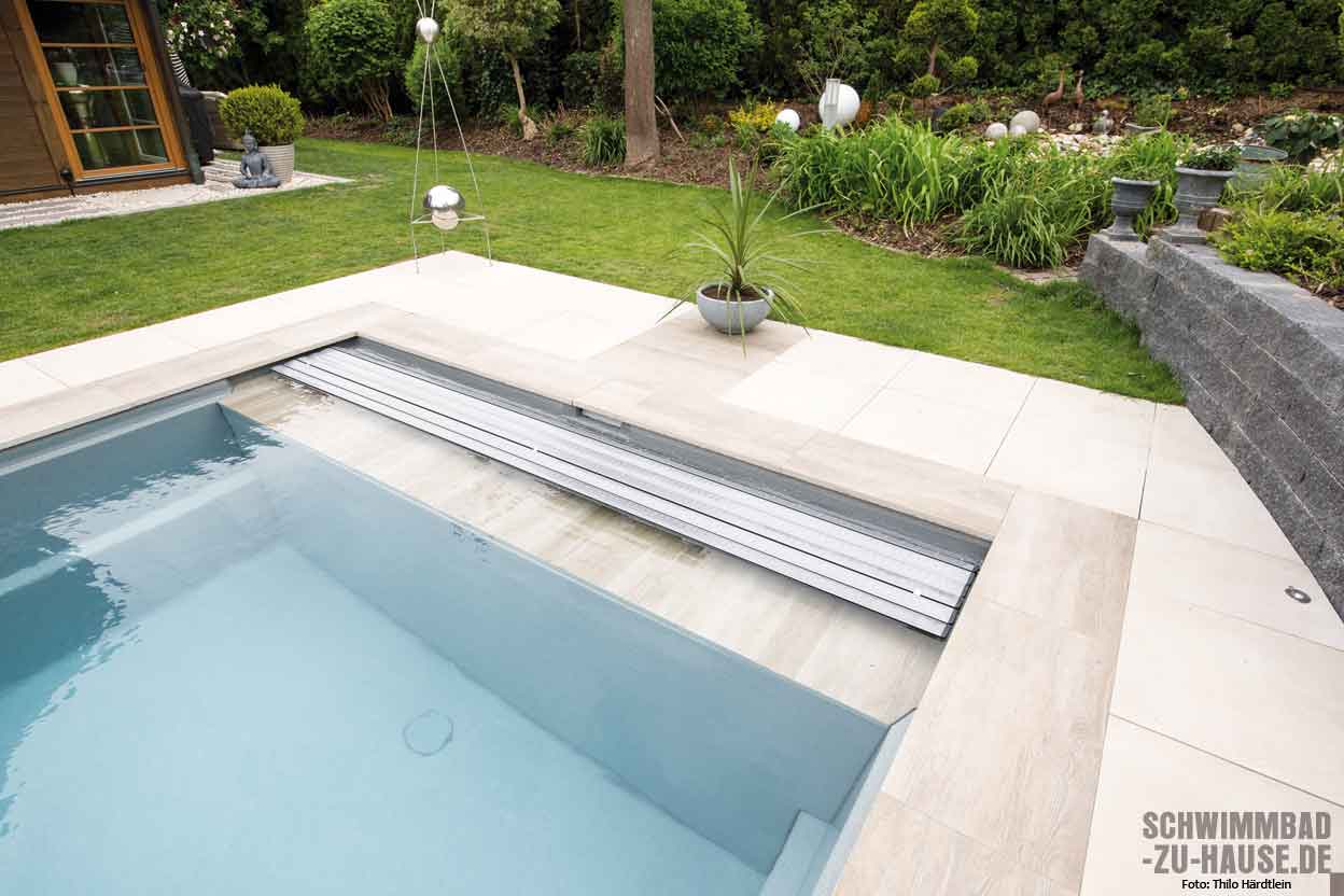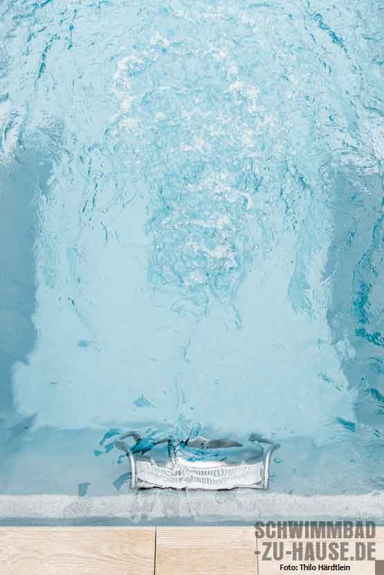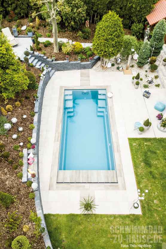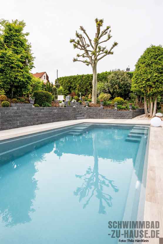 Probleme kennen wir nicht, die werden beseitigt“, sagt die Bauherrin mit einem Augenzwinkern über die Poolplanung, die einige logistische Herausforderungen mit sich brachte. Denn das auf einem Mittelgrundstück gelegene Haus ist bis auf die Frontseite von anderen Gebäuden und einer fünf Meter hohen Hecke umgeben. Der komplette Materialtransport hätte also über einen schmalen Weg quer durch die Gartenanlage erfolgen müssen, welche die Hausbesitzerin eigentlich erhalten wollte. Durch die Möglichkeit, ein abgestorbenes Stück Hecke zu entfernen, und das großzügige Entgegenkommen der Nachbarn, die dem Abtransport des Aushubs über ihrem Grundstück zustimmten, konnte der Traum vom eigenen Schwimmbecken deutlich einfacher realisiert werden.