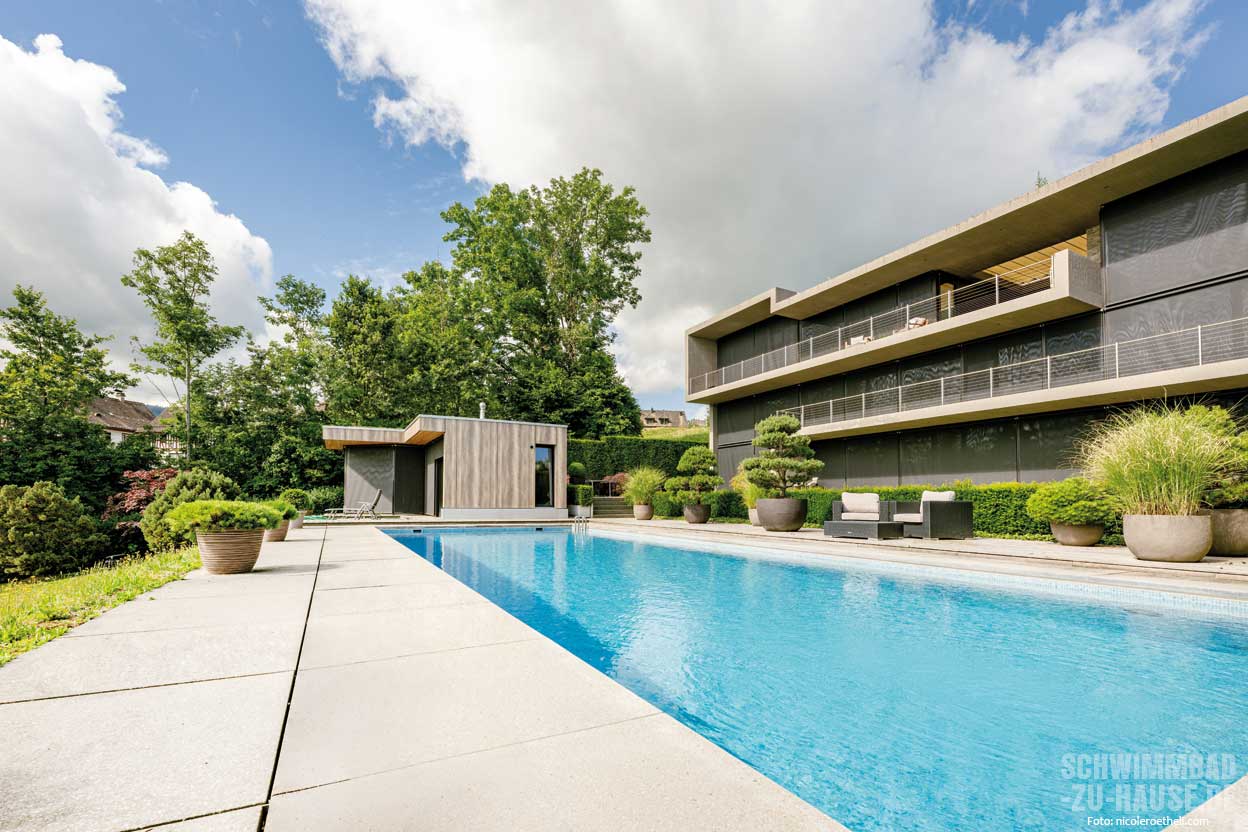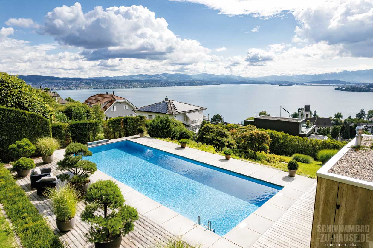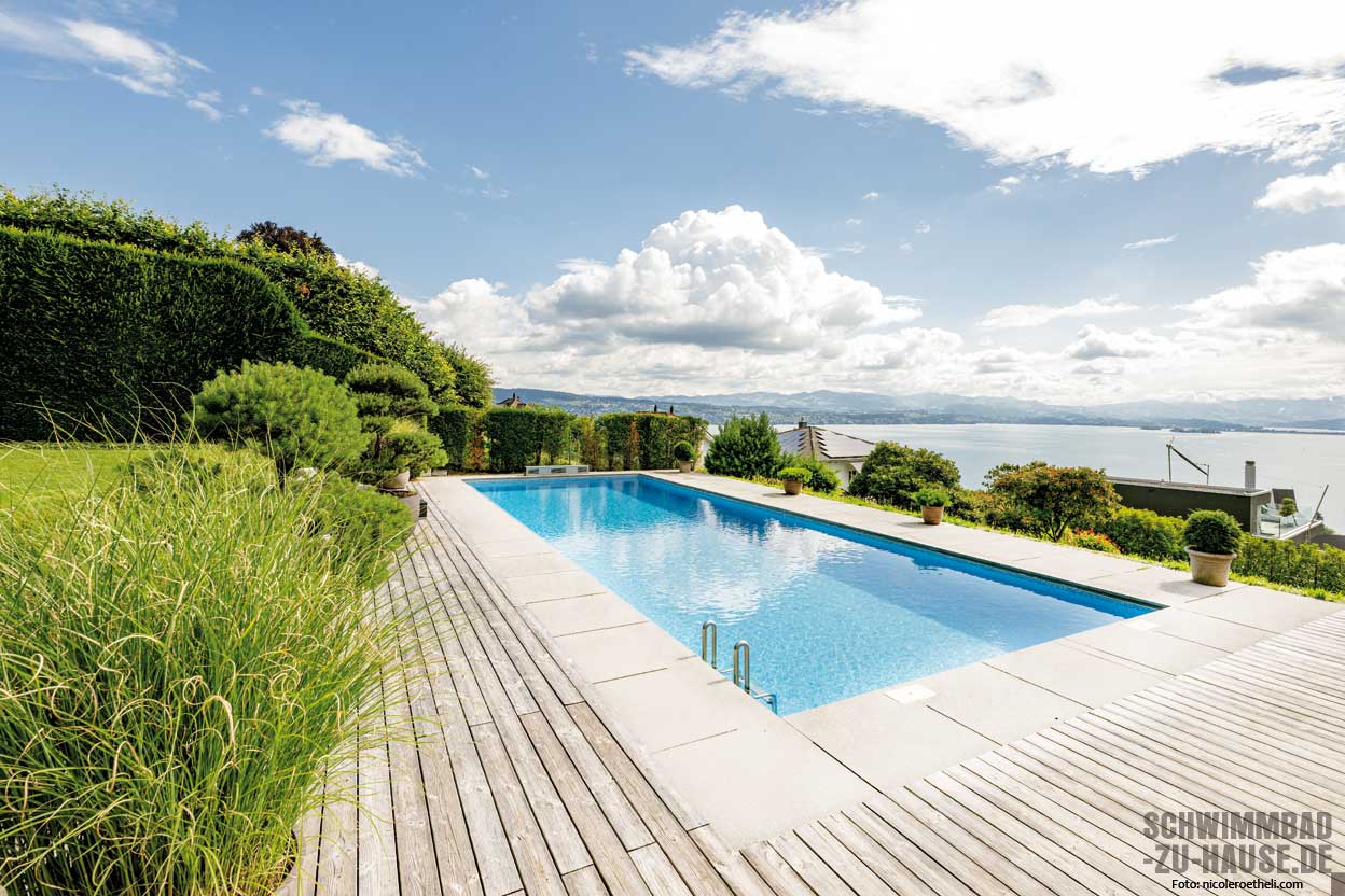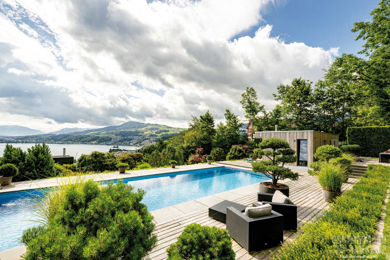 Wer an einer privilegierten Aussichtslage wohnt, genießt jeden Moment und verlässt sein Zuhause nur ungern. Doch wenn im Hochsommer die Temperaturen steigen, Badewetter herrscht und der Mensch sich nach Abkühlung sehnt, stellt sich die Frage: Wo findet man das erfrischende Nass? Ein harmonisch ins Anwesen integrierter Pool macht diesen Wohntraum perfekt.