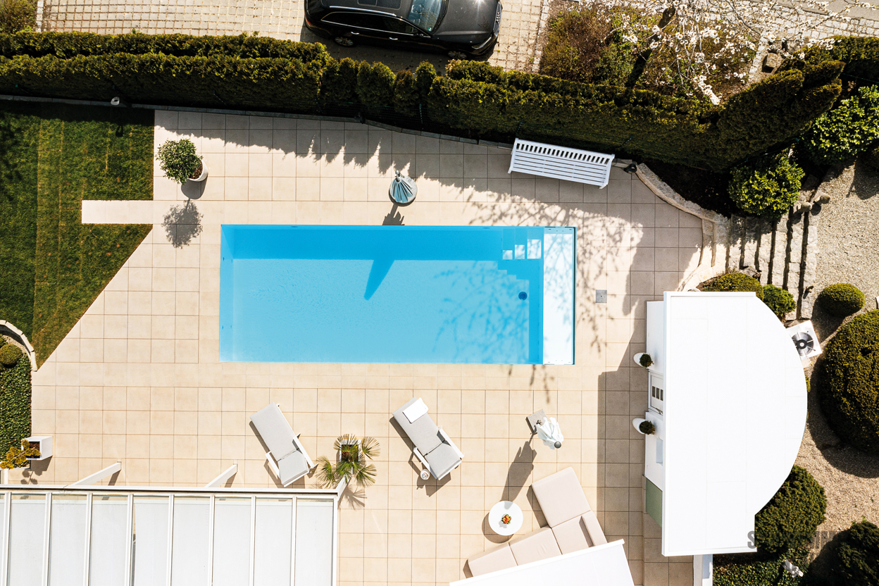 Die Wahl fiel auf das High-Tech-Polymer-Becken „Skimmer Invisible“ von Niveko, das mit seinen Maßen von 9,00 x 3,50 x 1,50 Meter und dem modernen, geradlinigen Design perfekt zu dem Anwesen passt. Der extra hohe Wasserstand bietet einige Vorteile in puncto Optik und Komfort und lässt den Pool mit seiner klaren Formensprache noch eleganter wirken. Eine Unterflur-Solarabdeckung mit weißen PVC-Lamellen, die bei Nichtgebrauch in einer Rollositzbank verschwindet, und eine Wärmepumpe helfen beim Energiesparen.
