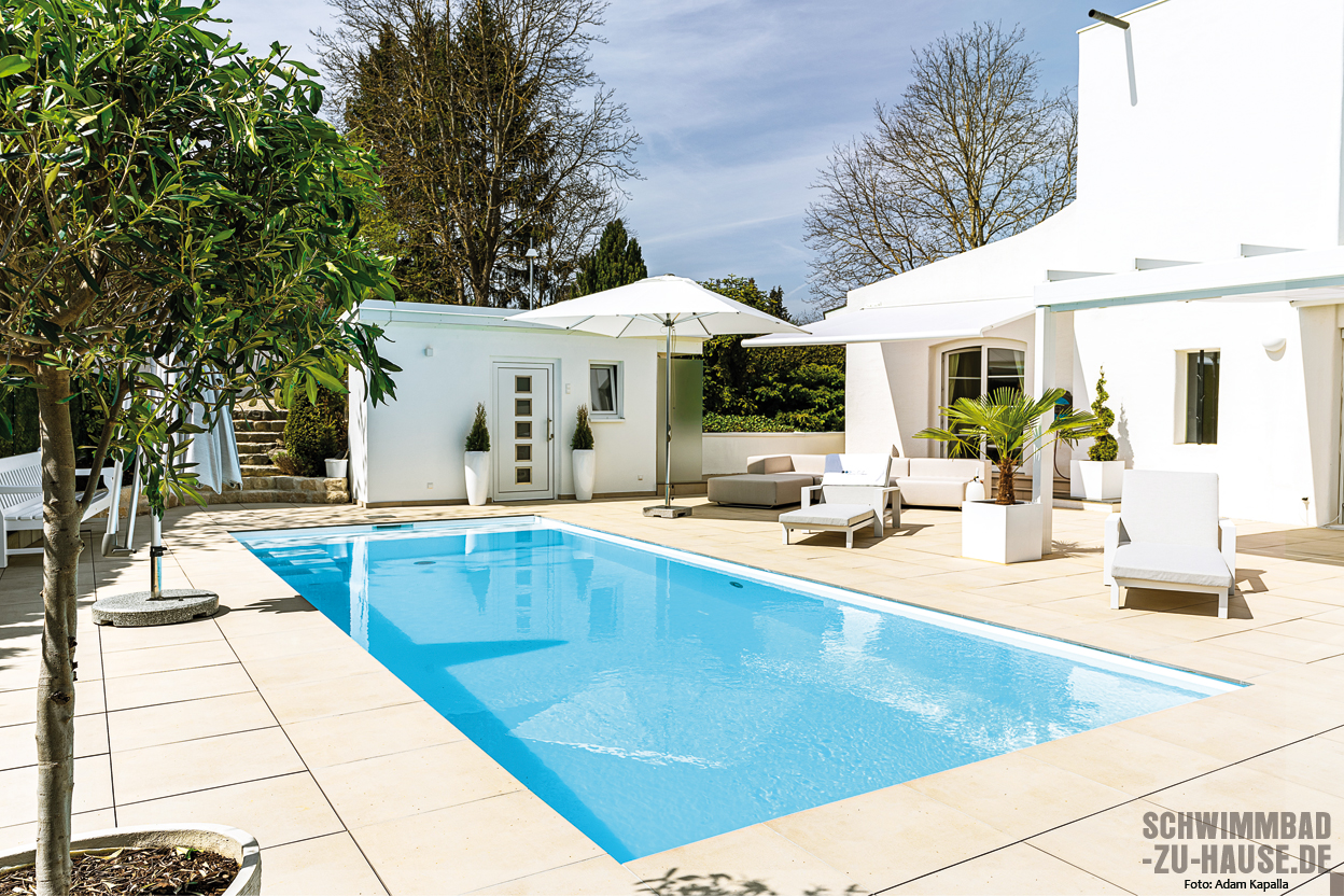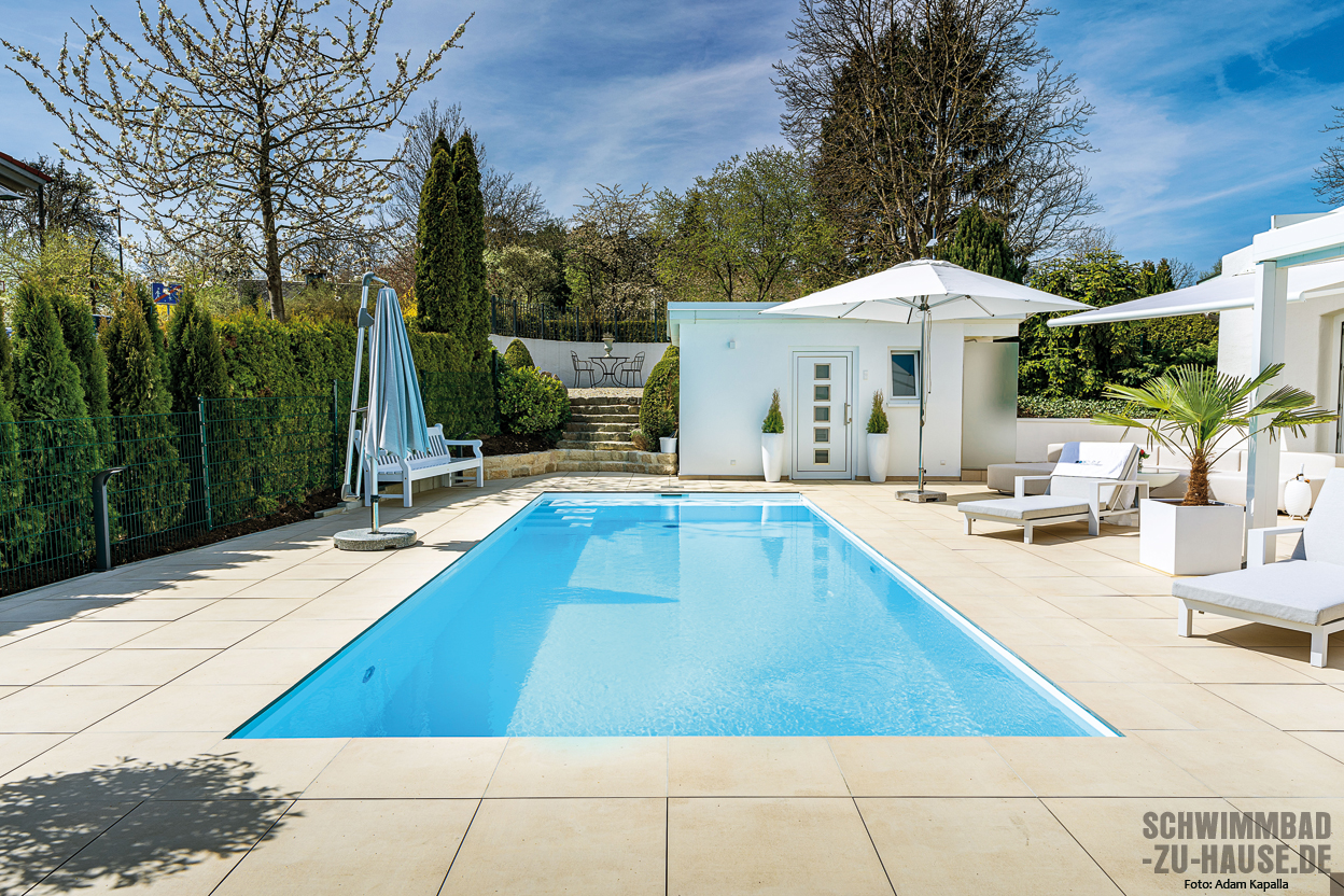 „Alles perfekt gelaufen“, freuen sich die Hausherren über ihren schmucken Pool, der den Mittelpunkt der großen Terrasse bildet und mit seinem türkisblauen Wasser unweigerlich die Blicke auf sich zieht. Für eine reibungslose Umsetzung eines solchen Poolprojekts seien aber ein zuverlässiges Serviceteam, gute Qualität und die Einhaltung der Absprachen unerlässlich, wird ausdrücklich betont.