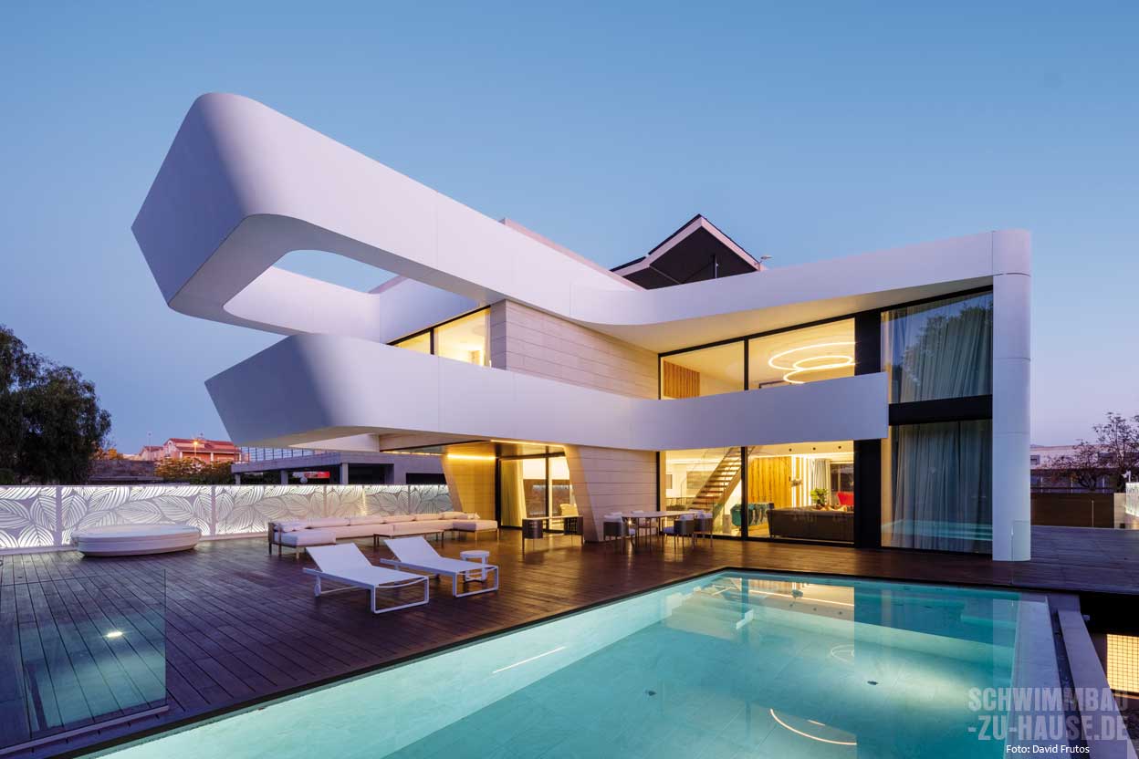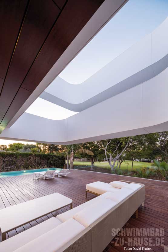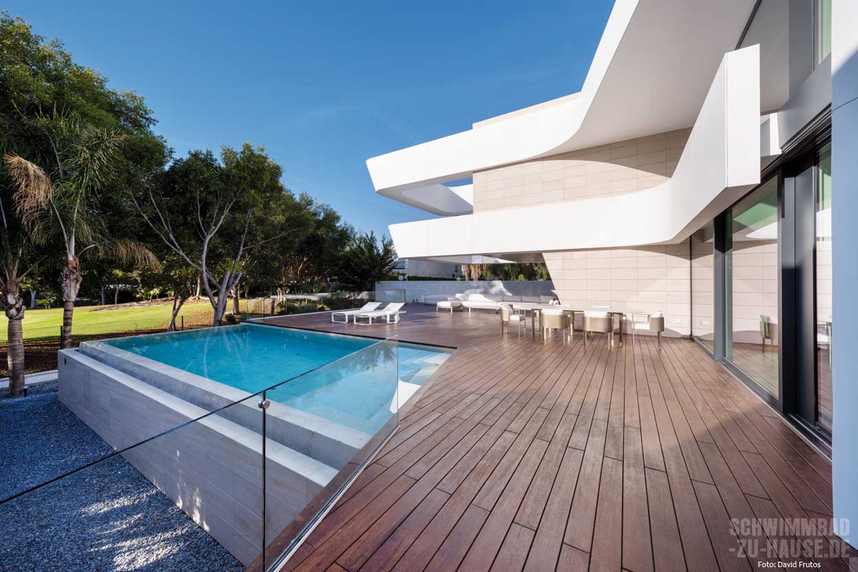 Die weit herausragenden, futuristisch anmutenden Gebäudeelemente machen das Anwesen zu einem architektonischen Highlight und spektakulären Blickfang. Sie dienen zugleich als Schattenspender für die großzügige Sitzgruppe darunter. In die weitläufige Terrasse wollten die Bauherren einen Pool integrieren, der nicht zuletzt wegen der kleinen Kinder im Haus über eine Abdeckung und permanent warmes Wasser verfügen sollte.