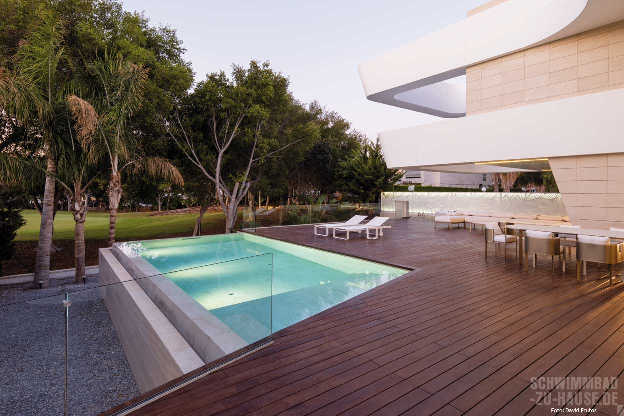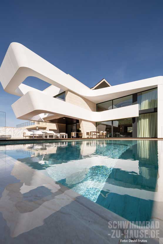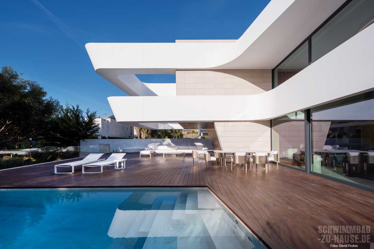 „Zuerst schien die Aufgabe ziemlich einfach, da es sich um ein relativ kleines Becken handelte. Dann wurde während der Bauphase alles etwas kompliziert“, erinnert sich Thomas Eichkorn, Chef der in Ondara ansässigen Firma Pool-Aesthetics. Das lag unter anderem an den beiden Flachwasserbereichen mit vier beziehungsweise sieben Meter Länge in einer Edelstahl-Konstruktion mit Acrylglas-Scheiben. „Dafür musste eine Acrylglasplatte von 1,5 x 7 Meter und einem Gewicht von 650 Kilogramm durch das fertige Haus transportiert werden“, nennt der erfahrene Schwimm- badprofi die größte Hürde beim Bau. Der Glasboden im Flachwasserbereich, der das Wasser zu einem Designelement im Innern werden lässt, ist eins von vielen Highlights. Der Blick vom unteren Geschoss durch das wasserdurchflutete Deckenelement ist ebenso ungewöhnlich wie spektakulär.