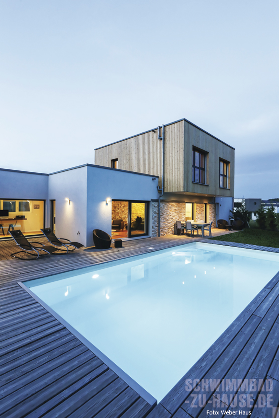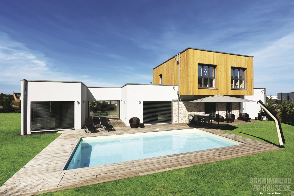 Bevor die junge Familie aus dem Elsass ihre bisherige Eigentumswohnung gegen das neue Traumhaus eintauschen konnte, mussten die individuellen Vorstellungen im Detail mit dem Weberhaus-Architekten und den Poolprofis besprochen werden. Neben einer klaren, modernen und puristischen Architektur wünschten sich die Bauherren ein energieeffizientes Haus, das aber zugleich allen vier Familienmitgliedern die Möglichkeit bietet, im privaten Rahmen dem Schwimmhobby nachgehen zu können. Der Pool sollte sich dabei architektonisch in die kubische Linienführung einfügen und eine Art Verlängerung des Wohnzimmers darstellen. „Wir wollten unbedingt ein Haus, dessen Fokus auf dem Außenbereich liegt, mit einem direkten Zugang zu Terrasse, Garten und Pool, damit wir gleichermaßen vom Außen- und Innenbereich profitieren können“, verrät uns auf Nachfrage Sandrine Cartier.