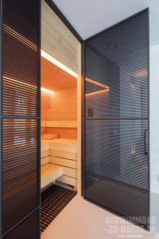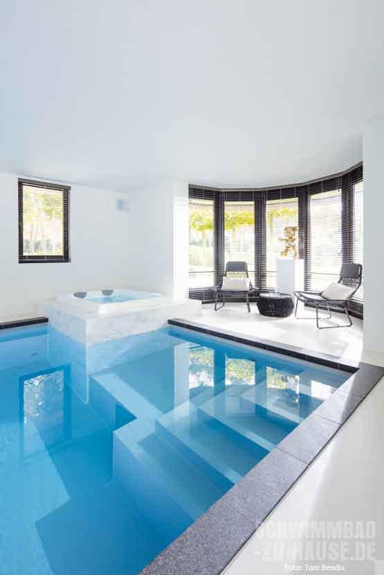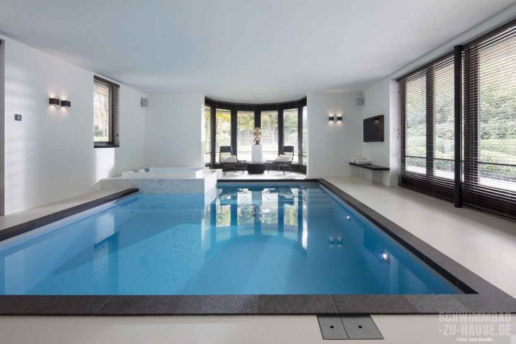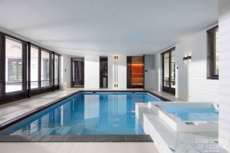 Hinsichtlich der Farbgestaltung hielten sich die Pool-Profis exakt an die Vorgaben der Bauherren: Schlichte schwarze Steine umranden das geradlinige, mit grauer Folie ausgekleidete Becken und stehen so in spannendem Kontrast zu dem hellgrauen Fußboden des Raumes. Genau wie das Becken präsentiert sich auch der exponierte Whirlpool streng geometrisch und fügt sich harmonisch in das moderne Gesamtbild ein. Elegant und clean, so lässt sich letzteres am besten beschreiben. Damit auch die Sauna, die das Maß an Entspannung zu Hause komplettieren soll, nicht störend ins Auge fällt, entschied man sich, diese einfach bündig in die Wand zu montieren.