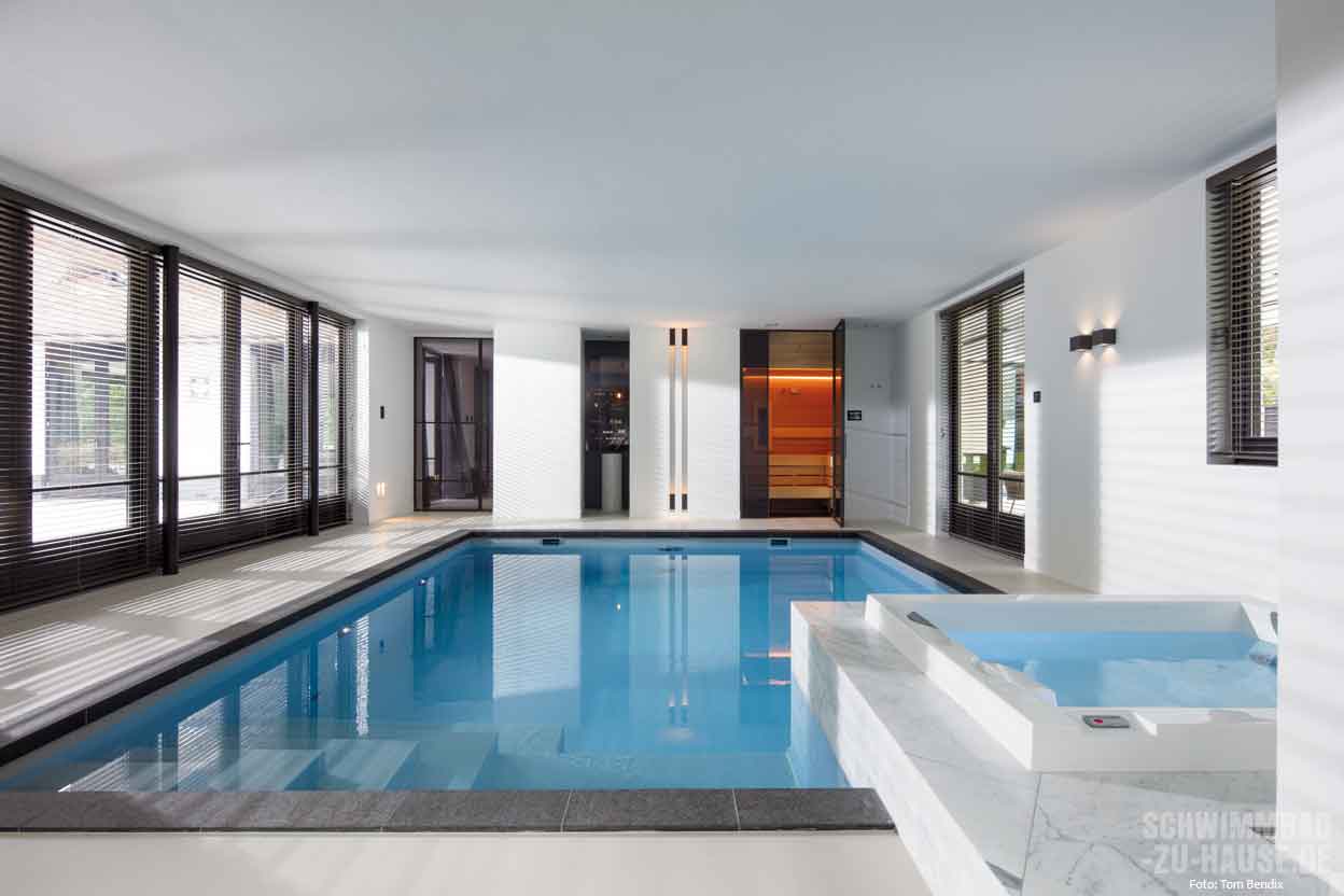 Dieses Hallenbad in den Niederlanden benötigte dringend ein Pool-Update. Braune Steine und eine ältere runde Treppe wichen daher einer Entspannungsoase mit modernem Charakter: Klare Linien des Schwimmbeckens, eine kontrastreiche Farbgebung aus hell und dunkel und gekonnt gesetzte Marmorakzente bestimmen jetzt das neue Erscheinungsbild des lichtdurchfluteten Raumes.
