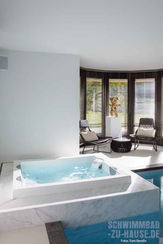 Nun waren die Bauherren nur noch auf der Suche nach dem passenden professionellen Schwimmbadbauer, der die Wünsche exakt realisieren kann. Von Freunden, die bereits beste Erfahrungen bei der Umsetzung ihres Pool-Projekts machen durften, erfuhren sie von dem erfahrenen Team von Ambiance Premium Wellness – und folgten der Empfehlung. Im Interview mit haus und wellness* verrät Fachmann Chris Milder, welche Herausforderungen diese Renovierung für das Team von Ambiance Premium Wellness darstellte: „Die Kunden wollten das ursprüngliche Wellness-Feeling beibehalten, sodass wir trotz größerer gestalterischer Modernisierungsmaßnahmen das originale Flair übernommen haben. Besonders heruasfordernd war darüber hinaus die Anpassung des an der Seite des Pools integrierten Whirlpools.“ Dieser wird von hochwertigen, großformatigen Marmorplatten eingefasst, die so gleichzeitig auch Außenwand des 6 x 4,5 Meter großen Folienbeckens sind. Demnach hatte absolute Dichtigkeit der Fugen zwischen Marmorplatten und Schwimmbadfolie oberste Priorität.