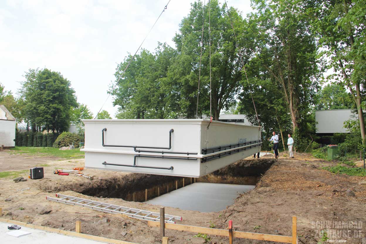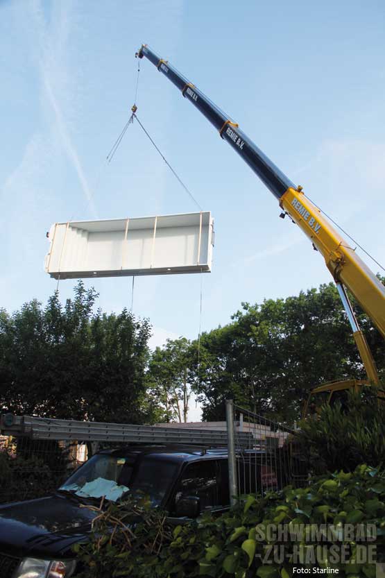 Sobald der vollständig in der belgischen Fabrik hergestellte Monoblock-Pool die Qualitäts- und Sicherheitsanforderungen erfüllt hat, wird er für den Transport vorbereitet. Je nach dem vereinbarten Installationszeitpunkt wird der Pool sicher gelagert, bis er auf den Transporter gehoben und zu Ihrem Standort transportiert wird. Jeder Schritt des Installationsprozesses wird von einem ausgewählten Starline-Händler durchgeführt, der nicht nur über umfassende Erfahrung verfügt, sondern auch alle rechtlichen und qualitativen Anforderungen im Auge behält.