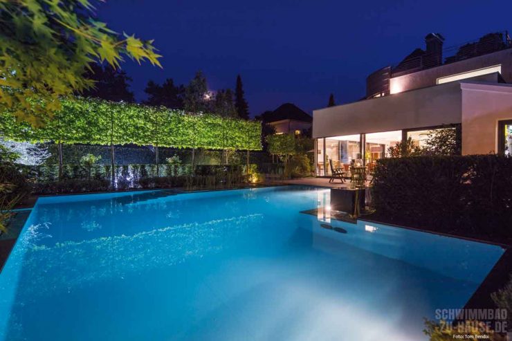 In enger Absprache und regem Austausch untereinander entschied man sich für ein geradliniges, leicht l-förmig wirkendes Betonbecken mit den Maßen 11 x 6 Meter. Es positioniert sich elegant an der Stirnseite des Grundstücks, die man vom Inneren des Hauses ideal einsehen kann. Eine Sichtschutzmauer, die die kubistische Architektur des Wohnhauses aufgreift, und eine geordnete Spalierbepflanzung grenzen die Badeoase optisch von den anderen Grundstücken und der Freifläche des Gartens ab. Ausgelegt wurde das Schwimmbecken mit einer türkisfarbenen Teichfolie. Diese lässt das Wasser tropisch schimmern und setzt – inmitten der grünen Oase – einen kräftigen Farbakzent.