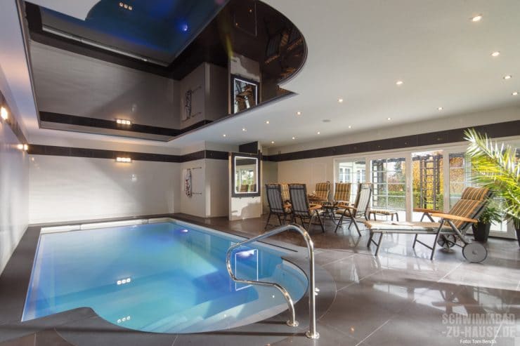„Die größte Hürde bei der Umsetzung des Plans war es, das Becken in die vorhandene Halle zu bekommen. Es stand nur ein großes Fenster zur Verfügung und der Platz war insgesamt sehr beengt. Wir mussten mit sehr viel Fingerspitzengefühl arbeiten“, erklärt uns beim Interview der Schwimmbadprofi Stephan Glocke.