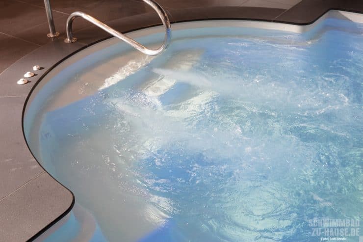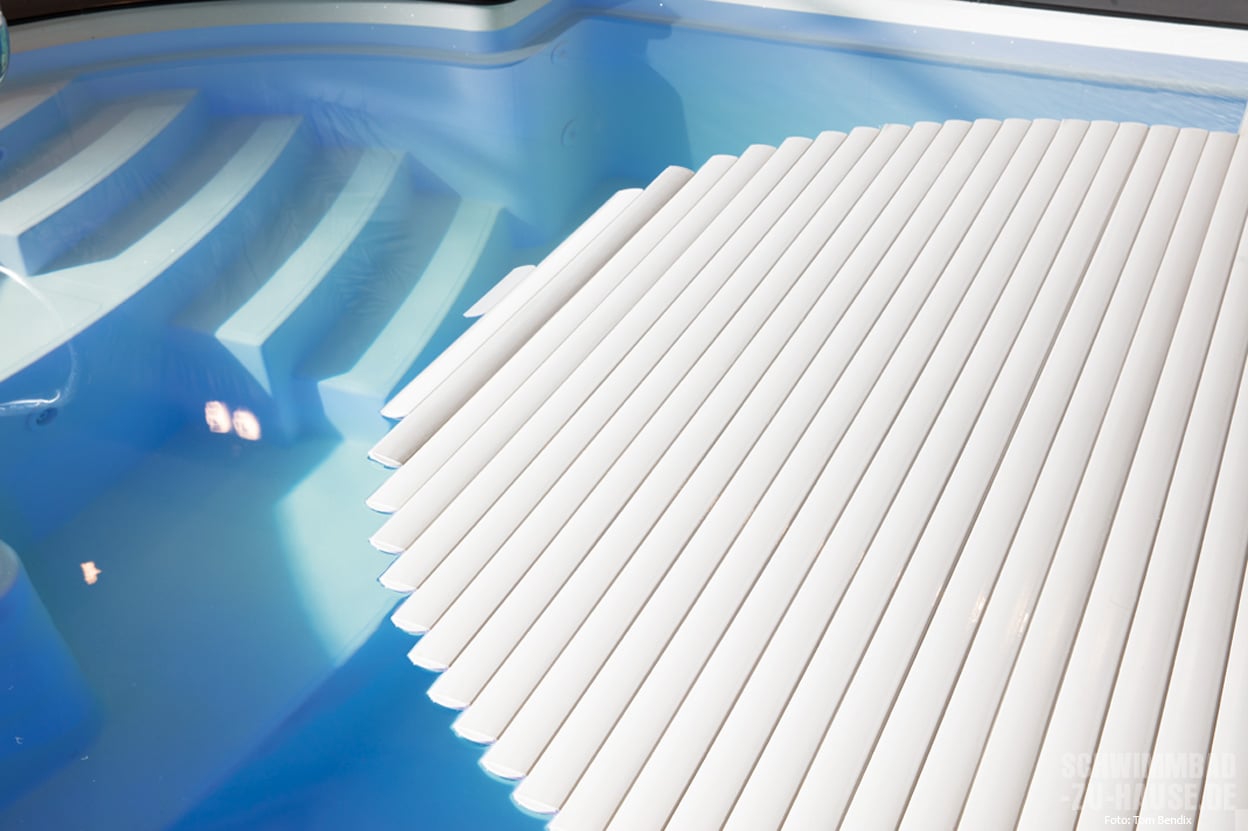 Um die Vorgaben der Bauherrin zu erfüllen, entschied man sich für das moderne und im Trend liegende Aquacomet-Fertigbecken „Seaview Beach“ mit hochgesetztem Wasserstand, Römertreppe, Sitzbank, Liege und einem Unterflurrolladen. Für den sportlichen Charakter sorgt eine zweistrahlige Gegenstromanlage. Damit ist auch in einem kompakten Becken mit den Maßen 7,75 x 3,75 x 1,50 Meter der tägliche Morgensport ein echtes Wasservergnügen. Ein besonderes Entspannungs- und Wellness-Element bietet die verbaute Massageanlage.
