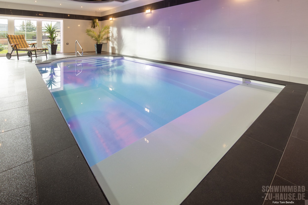 Ihr Wunsch war es, anstelle des in die Jahre gekommen Pools, eine moderne und kompakte Wellnessoase in der ebenerdigen Halle zu erstellen. Dabei sollte das Becken einen hochgesetzten Wasserstand aufweisen, energieeffiziente Features enthalten und einen sportlichen Charakter besitzen. Zudem sollte die neu definierte Spa-Oase eine stimmungsvoll beleuchtete und entspannende Gesamtausstrahlung mit optisch ansprechender Geometrie besitzen.
