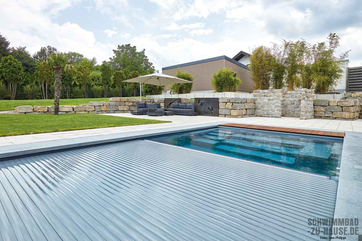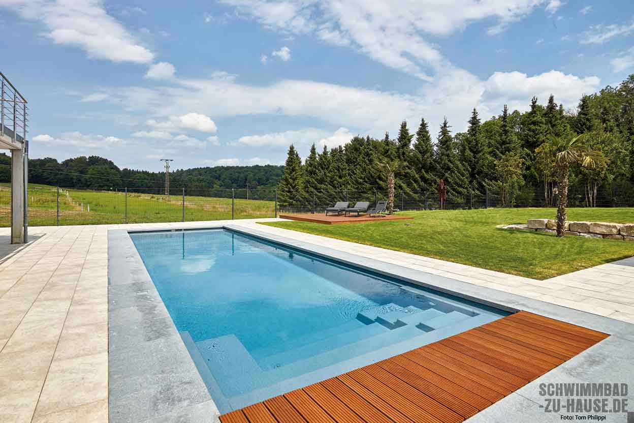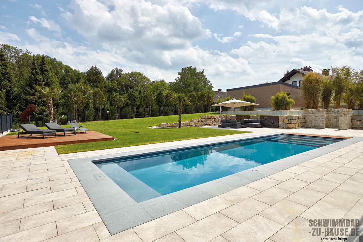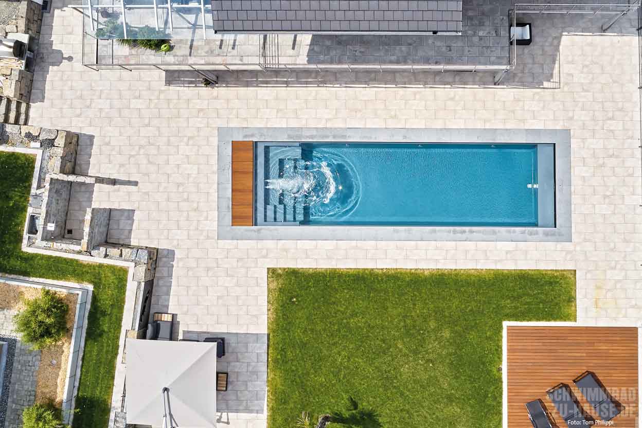 einige Ideen und Vorstellungen entwickelt hatte, musste seitens des Schwimmbadbauers kein neues Konzept erstellt werden. „Die Außengestaltung hat der Bauherr komplett selbst übernommen“ verrät Andreas Sorg von der Firma Sorg Schwimmbäder im Interview mit haus+wellness*.