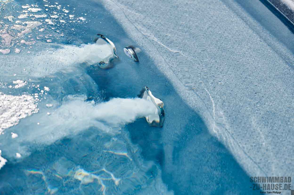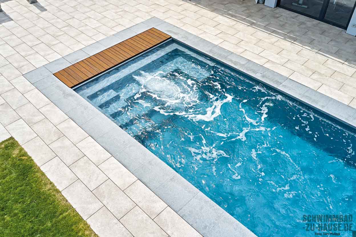 Bei der Auswahl des Pools sollte berücksichtigt werden, dass die Familie diesen gerne zum ausgiebigen Schwimmen nutzen würde. Betrachtet man den Garten genauer, fällt einem eines besonders auf: Er verfügt über jede Menge Platz. Dementsprechend konnte problemlos ein Becken eingebaut werden, welches von den Standardmaßen abweicht – in diesem Fall das Modell „Modena“ von Riviera Pool mit einer respektablen Größe von 11,75 x 3,70 Metern. Auch für die Schwimmbadbauer sind derartige Projekte nach Andreas Sorg eine „schöne Abwechslung“. Trotz der Schwimmaffinität der Familie weiß der Pool auch an anderen Stellen zu überzeugen. Mit einer Massageanlage, die unter anderem sechs Microjet-Massagedüsen und einen Bodengeysir beinhaltet, kommt im Schwimmbad auch die Entspannung nicht zu kurz. Und sollte es mal etwas voller werden und das klassische Bahnen ziehen dadurch erschwert sein, kann man sich auch an der effizienten Gegenstromanlage auspowern.