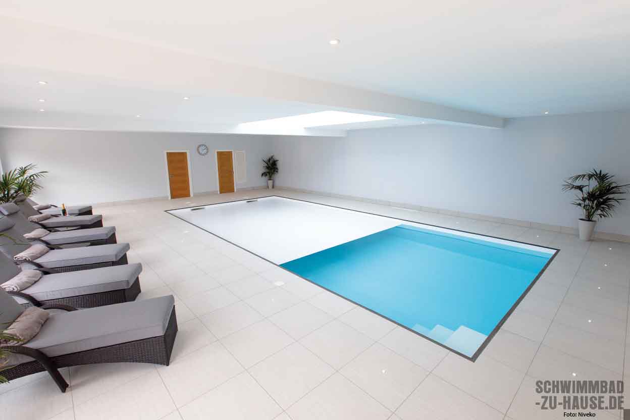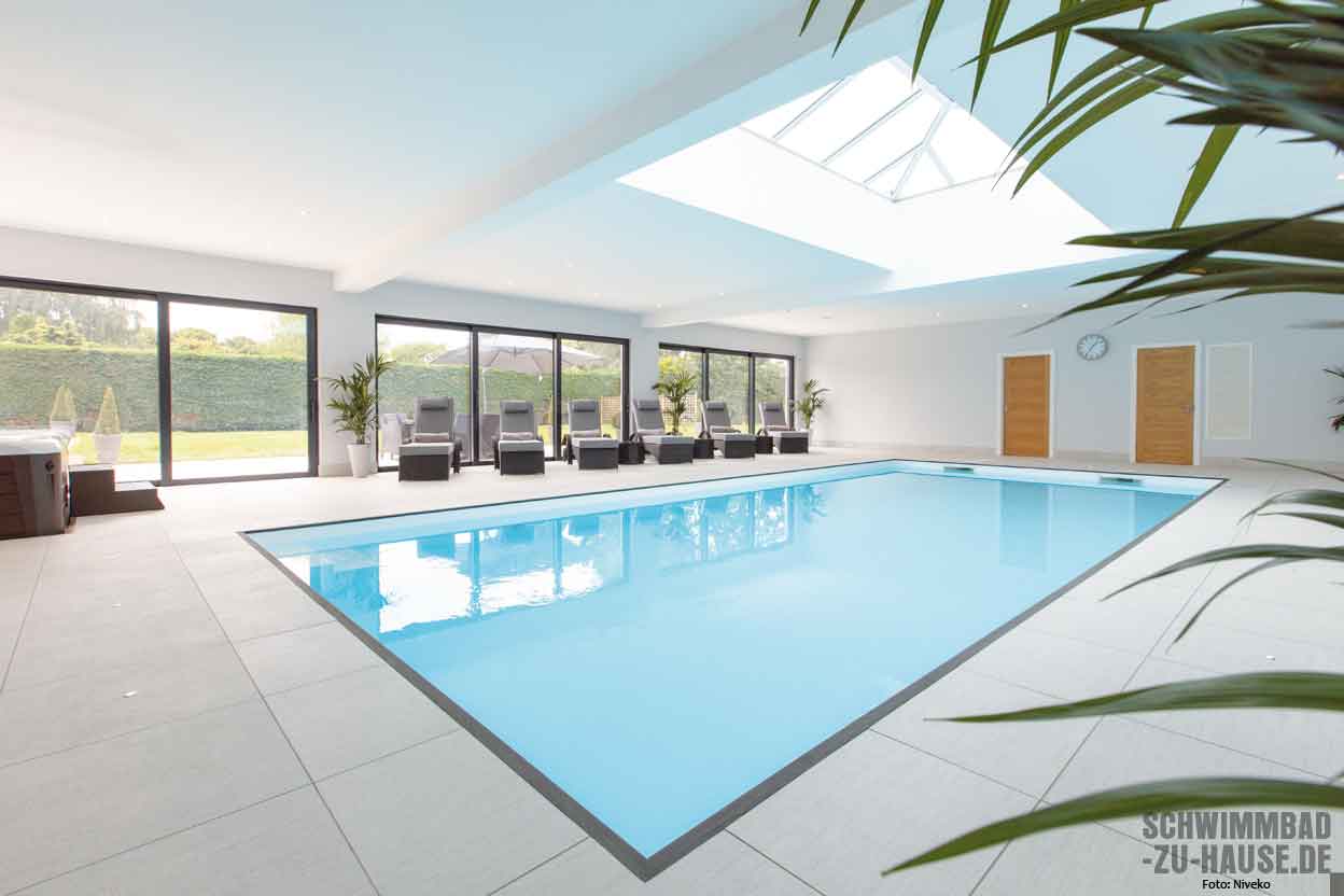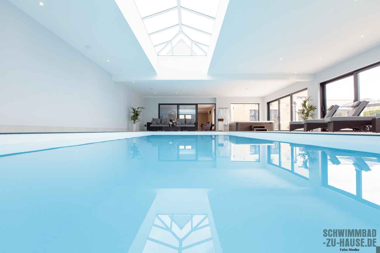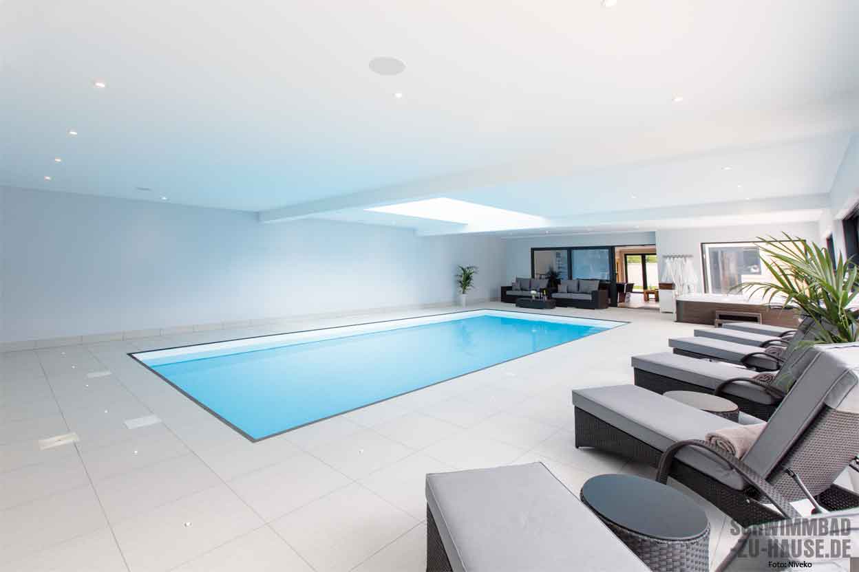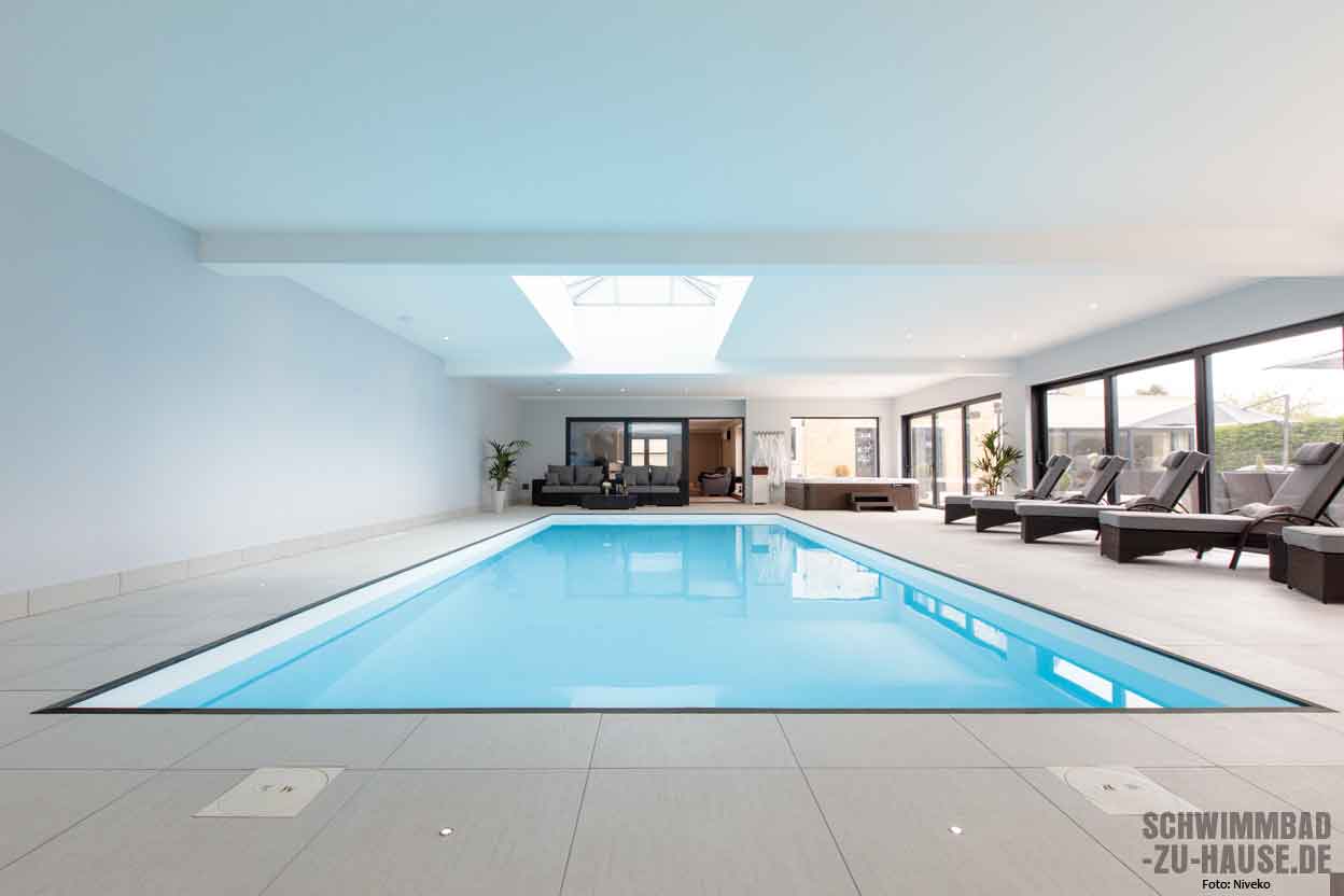 Herzstück und wichtigstes Element der Poolhalle ist ohne Frage das moderne rechteckige Einstückbecken „Skimmer Top Level“ von Niveko mit den Maßen 10,00 x 4,50 x 1,50 Meter. Dank der eleganten Lösung dieses Modells reicht der Wasserspiegel fast bis zum Beckenrand, sodass Badewasser und Poolumgebung optisch nahezu miteinander verschmelzen. In Kombination mit der Beckenfarbe Weiß und der schlichten Einstiegsvariante „Modern“, die sich dezent in die Ecke des Beckenkörpers einfügt und die Familie sicher ins Wasser führt, schuf Lewis von Hot Tub People so ein harmonisches Entspannungsareal der Extraklasse.