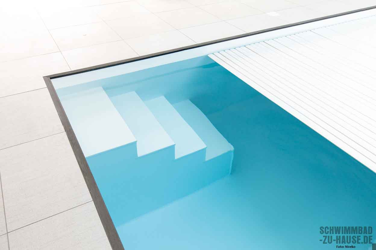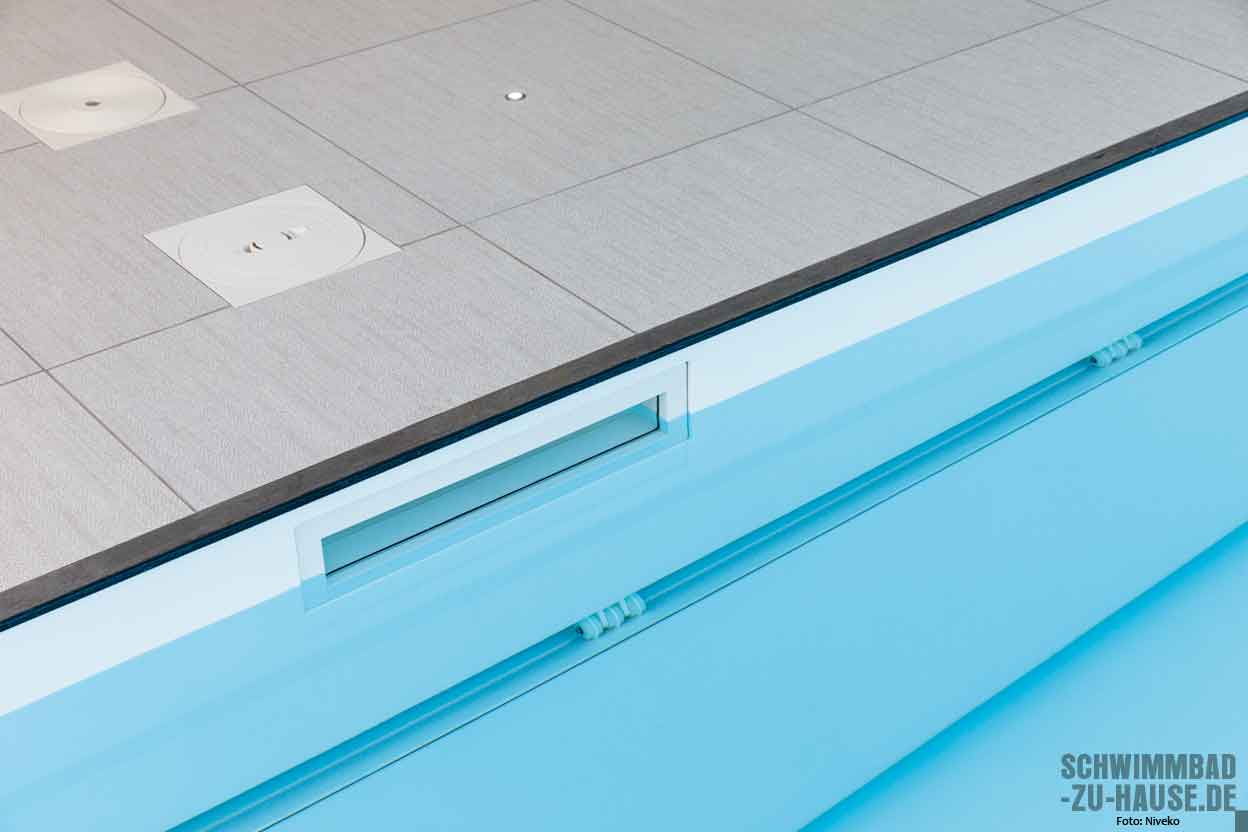 Übrigens: Da Skimmer und Rollladenabdeckung aus PVC ebenfalls in unauffälligem Weiß gestaltet wurden, fallen sie nicht störend ins Auge und bilden eine gestalterische Einheit mit dem Schwimmbecken.
