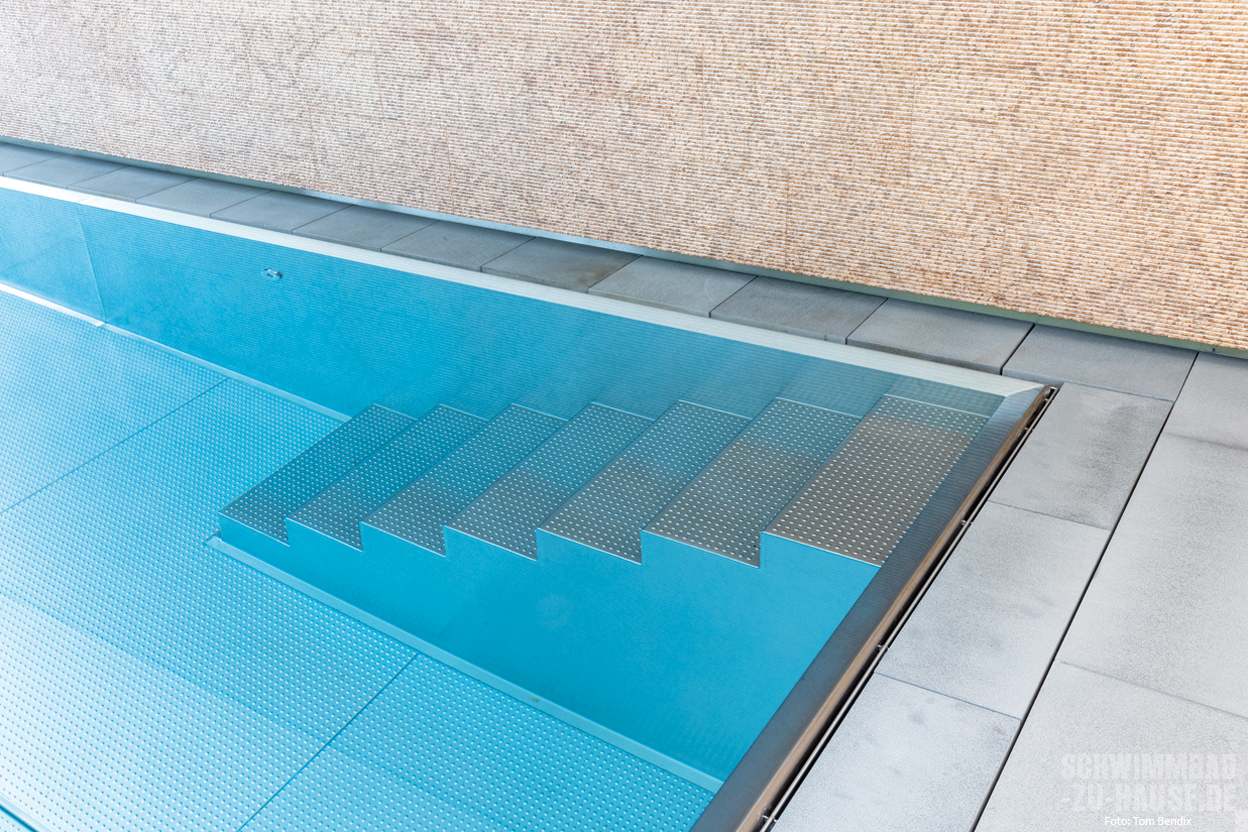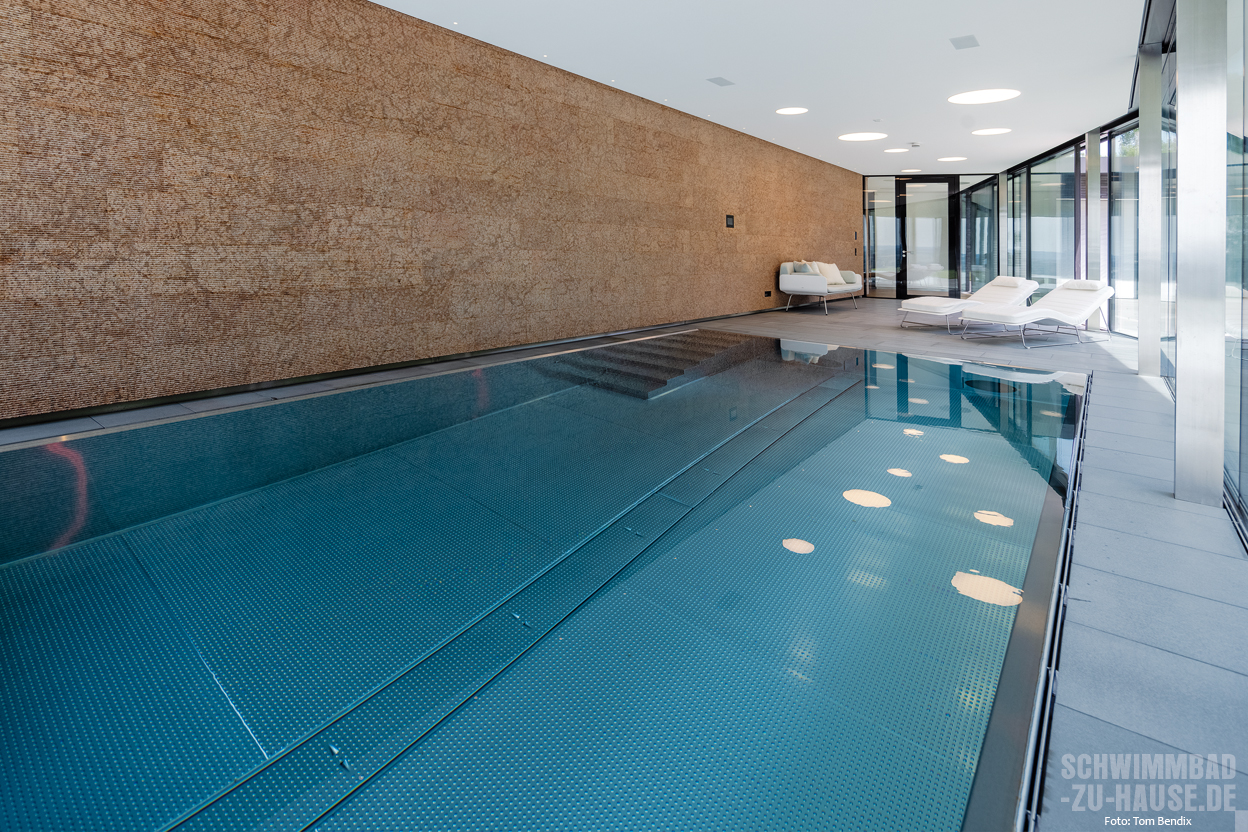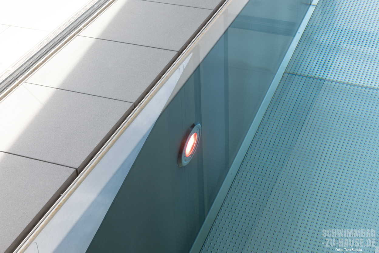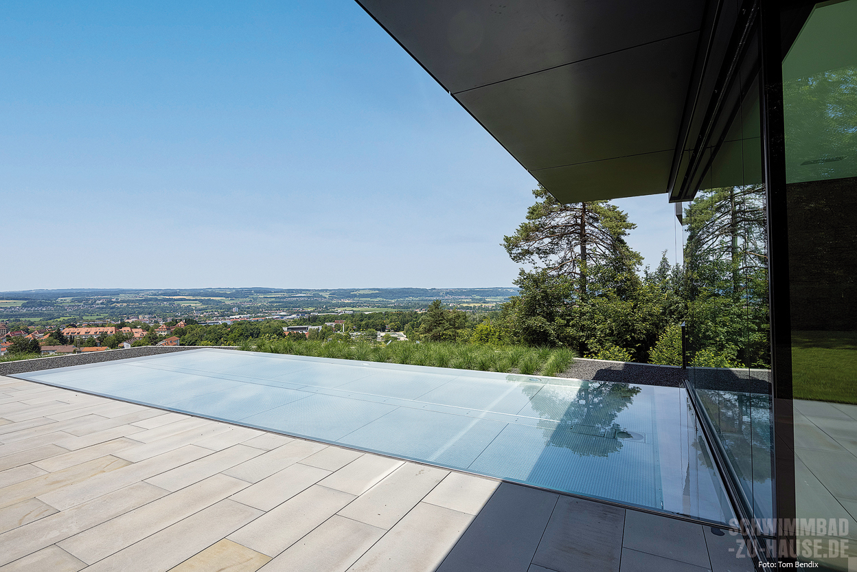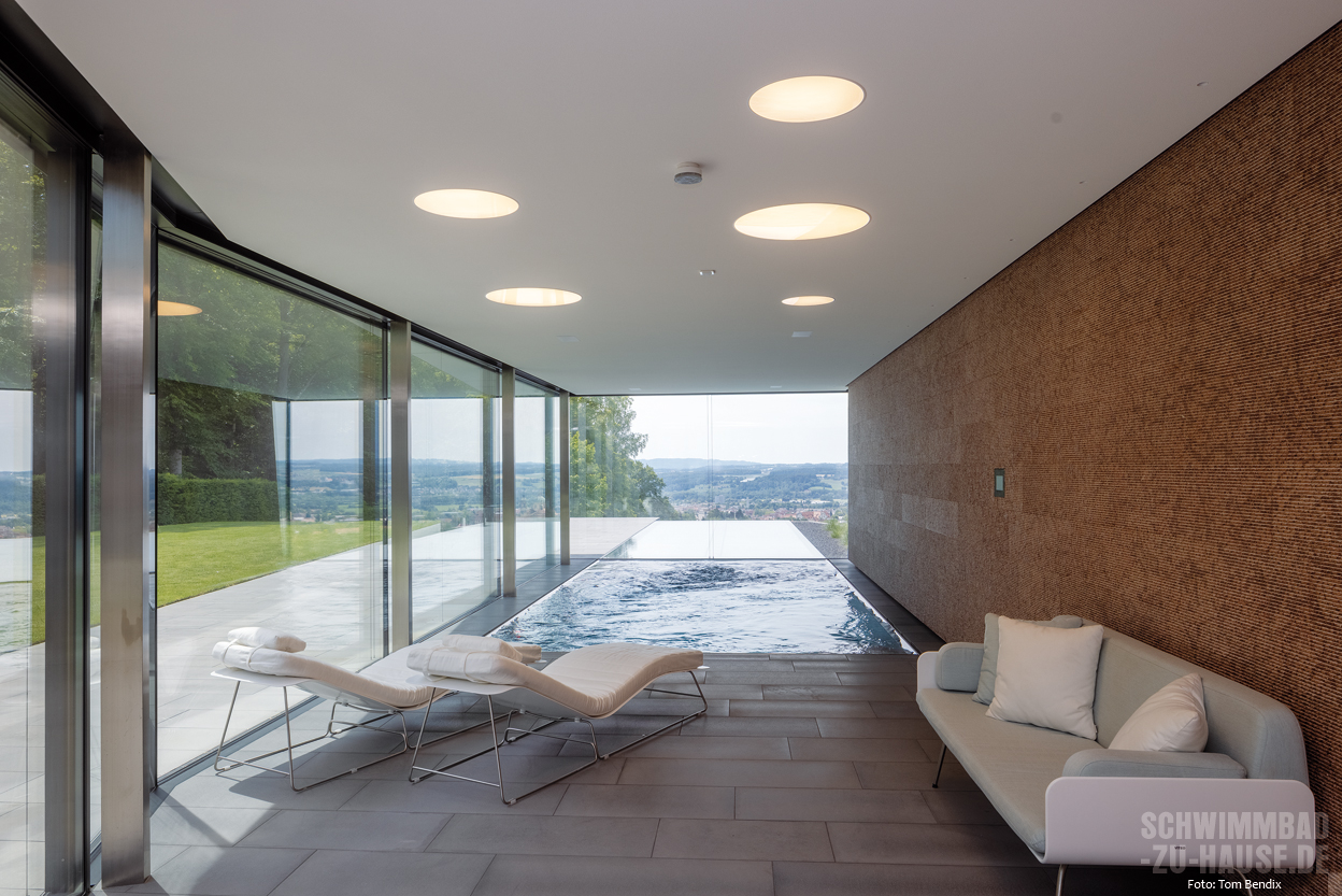 Als Wohlfühlidee des Projekts wurde dabei die Transparenz in den Garten und die angrenzende Natur definiert. Dazu wurde am Becken eine Überlaufrinne an der Glasscheibe zwischen Innen- und Außenareal angebracht, um den Eindruck eines durchlaufenden Wasserspiegels entstehen zu lassen. Dies war eine nicht ganz einfache Gestaltung, bei der äußerste Präzision gefragt war.