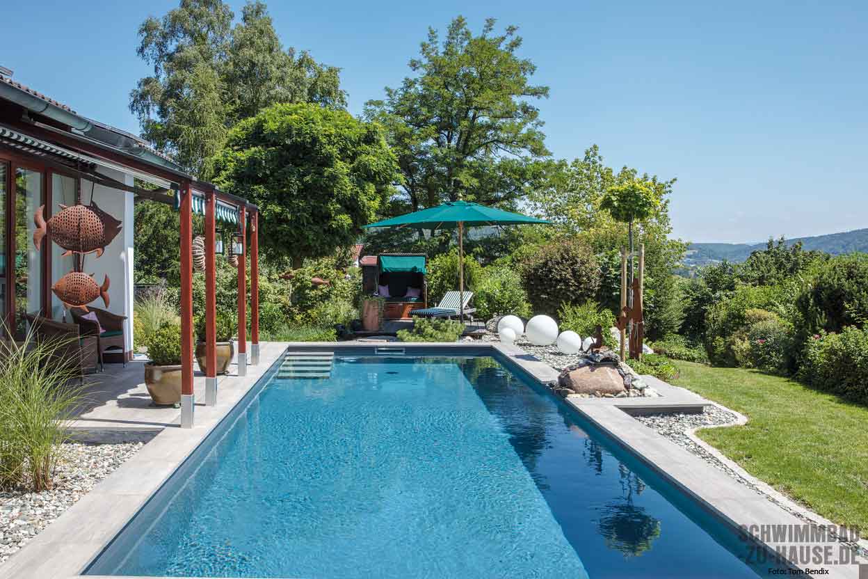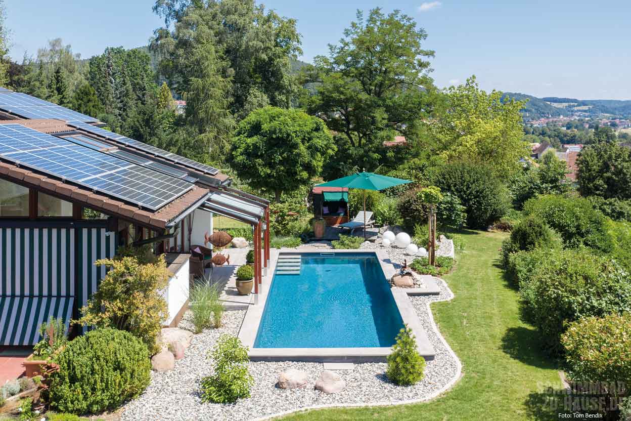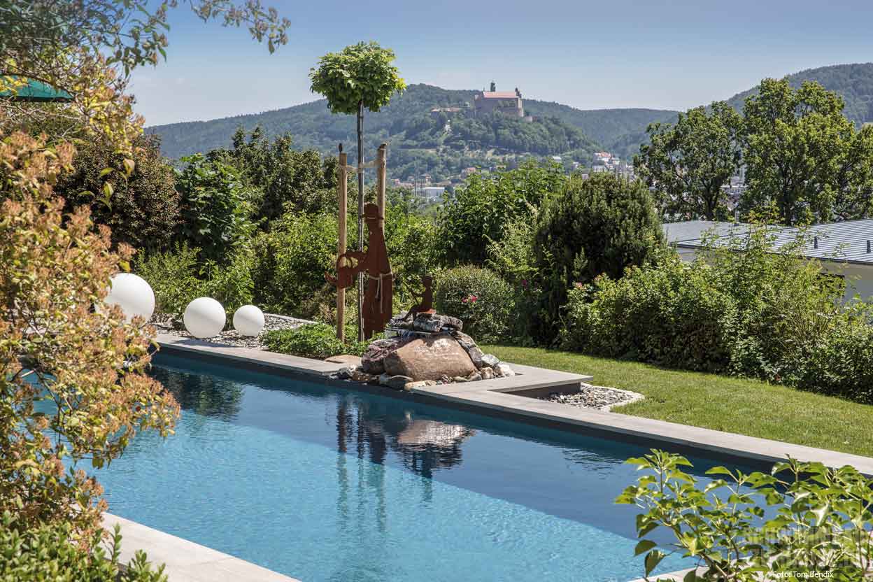 Leicht wärmen einzelne Sonnenstrahlen die Haut und trocknen hier langsam Wassertropfen vom morgendlichen Bad, Blütenduft und der Geruch von frisch gemähtem Rasen liegen in der Luft, wohin das Auge schweift, erblickt es saftig grüne Bäume, Gräser und Pflanzen … In diesem gemütlichen Garten im bayerischen Kulmbach kann man ungestört inmitten der Natur entspannen und den stressigen Alltag wahrlich für einige Stunden vergessen. Direkt im Zentrum der grünen Oase hinter dem Haus des Bauherrenpaares befindet sich seit Kurzem ein mit tropisch Blau schimmerndem Wasser gefülltes Schwimmbecken.