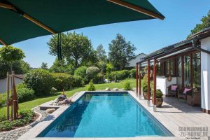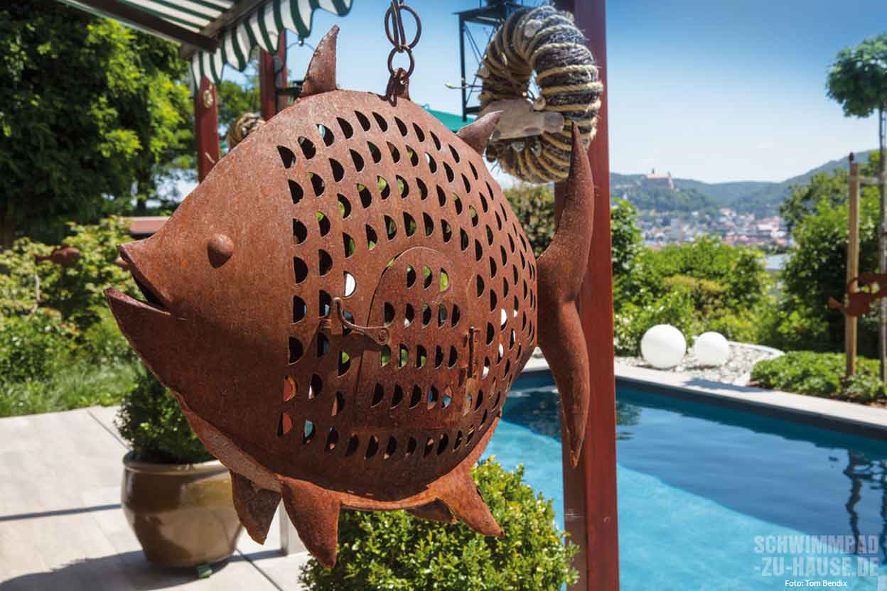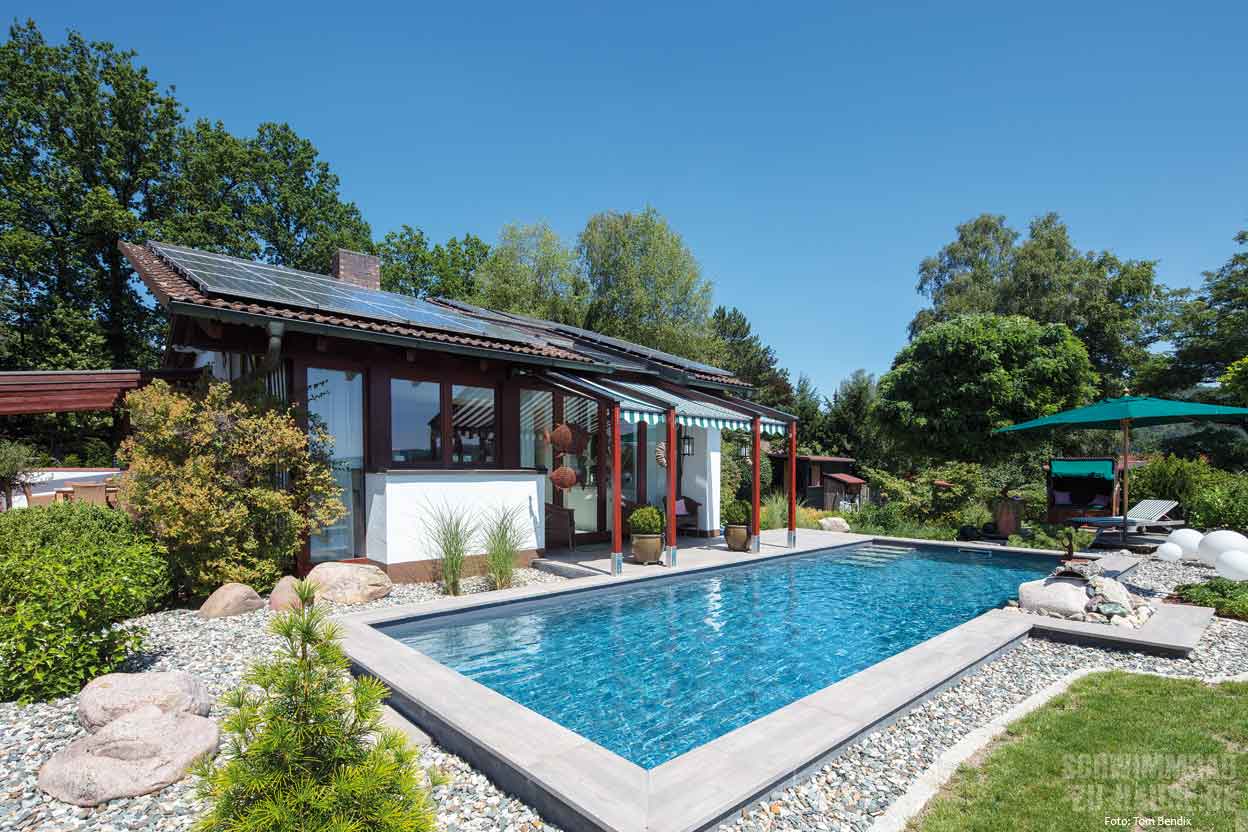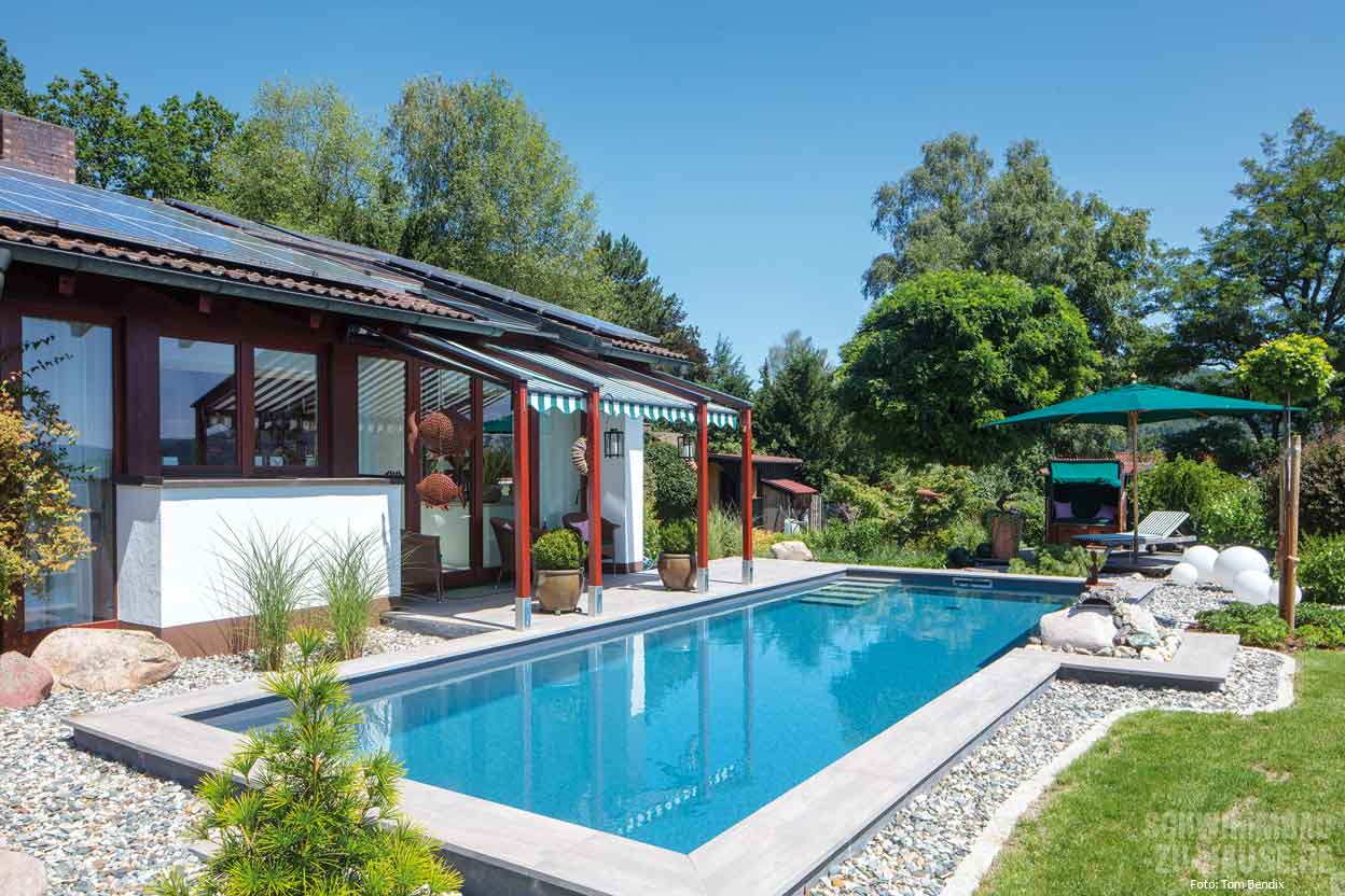 Leicht wärmen einzelne Sonnenstrahlen die Haut und trocknen hier langsam Wassertropfen vom morgendlichen Bad, Blütenduft und der Geruch von frisch gemähtem Rasen liegen in der Luft, wohin das Auge schweift, erblickt es saftig grüne Bäume, Gräser und Pflanzen … In diesem gemütlichen Garten im bayerischen Kulmbach kann man ungestört inmitten der Natur entspannen und den stressigen Alltag wahrlich für einige Stunden vergessen. Direkt im Zentrum der grünen Oase hinter dem Haus des Bauherrenpaares befindet sich seit Kurzem ein mit tropisch Blau schimmerndem Wasser gefülltes Schwimmbecken.