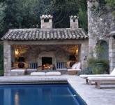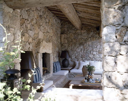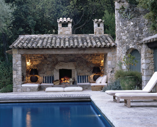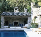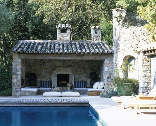 Zum neuen Juwel des Anwesens und Lieblingsplatz der Schweizer Familie wurde der umgebaute Barbereich am Ende des Pools. Zarzycki ließ sich hier von einer sogenannten „sofra“, einem typischen türkischen kleinen Wohnraum inspirieren. Die Outdoor-Lounge ist ganz aus Stein gebaut, dicke Holzbalken stützen das Ziegeldach. Ein zentraler Feuerplatz und niedrige Sitzgelegenheiten unterstreichen das gemütliche Ambiente, der schattige Platz lädt zum Ausruhen und Entspannen nach einem ausgiebigen Sonnenbad ein. Ein farbenfroher kleiner Teppich, große marineblaue Kissen und der massive Holztisch sorgen für eine warme Ausstrahlung. Alte indianische Wasserkessel geben dem Raum einen exklusiven Touch. „Es ist wundervoll an einem Sommerabend um das Feuer am Pool zu sitzen, einen Drink zu genießen und die Sonne untergehen zu sehen“, schwärmt Zarzycki.