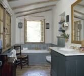 Aus dem angrenzende Badezimmer sollte eine luftiger, hellerer Raum werden. Deswegen haben hier nur die Badewannen – und Waschtischfliesen einen dezenten blauen Farbton, die Wände sind naturfarben gehalten. „Um die Leichtigkeit des Raums zu erhalten, vermieden wir außerdem frei stehende Einrichtungselemente und schufen hinter dem Spiegel einen Platz, wo man das übliche Badzubehör verstecken kann“, plaudert Zarzycki aus dem Nähkästchen. Das Gesamtergebnis der langen Planung und Restaurierung: Das neue alte Haus wirkt, wie es die Besitzer sich erhofft hatten: als wäre es nie anders gewesen. „Glückliche und zufriedene Kunden, das ist die schönste Belohnung in meinem Job“, freut sich Zarzycki stolz.