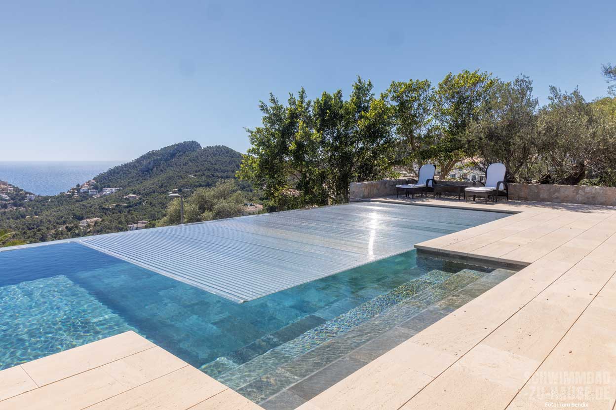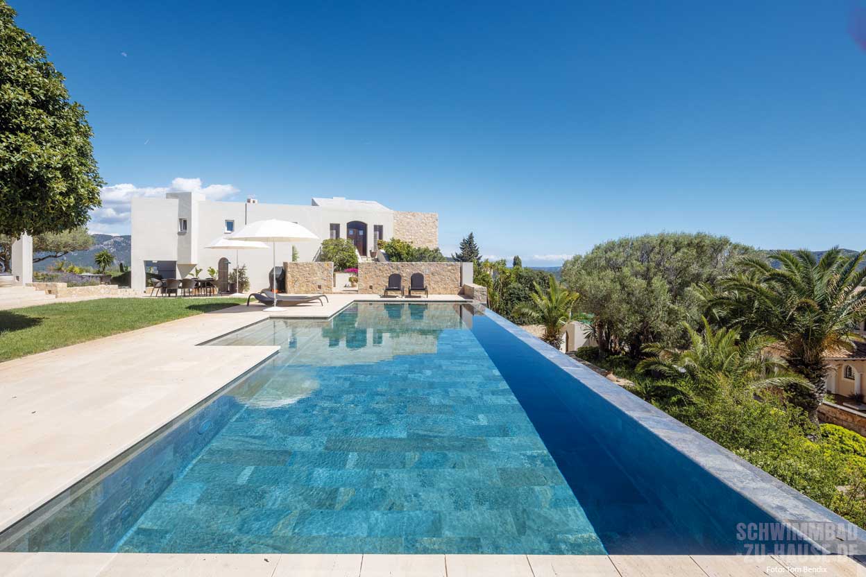 Mit einem atemberaubenden Blick auf eine malerische Bucht und die sanften Hügel Mallorcas liegt dieser spektakuläre Pool, der das Herzstück eines privaten Anwesens bildet. Großformatige Natursteinfliesen und ein einseitiger Infinity-Überlauf schaffen eine Atmosphäre von zeitloser Eleganz und Luxus. Von hier aus genießen die Bauherren nicht nur ein Stück Paradies, sondern auch die Erfüllung ihres Traums vom perfekten Garten- und Poolbereich.