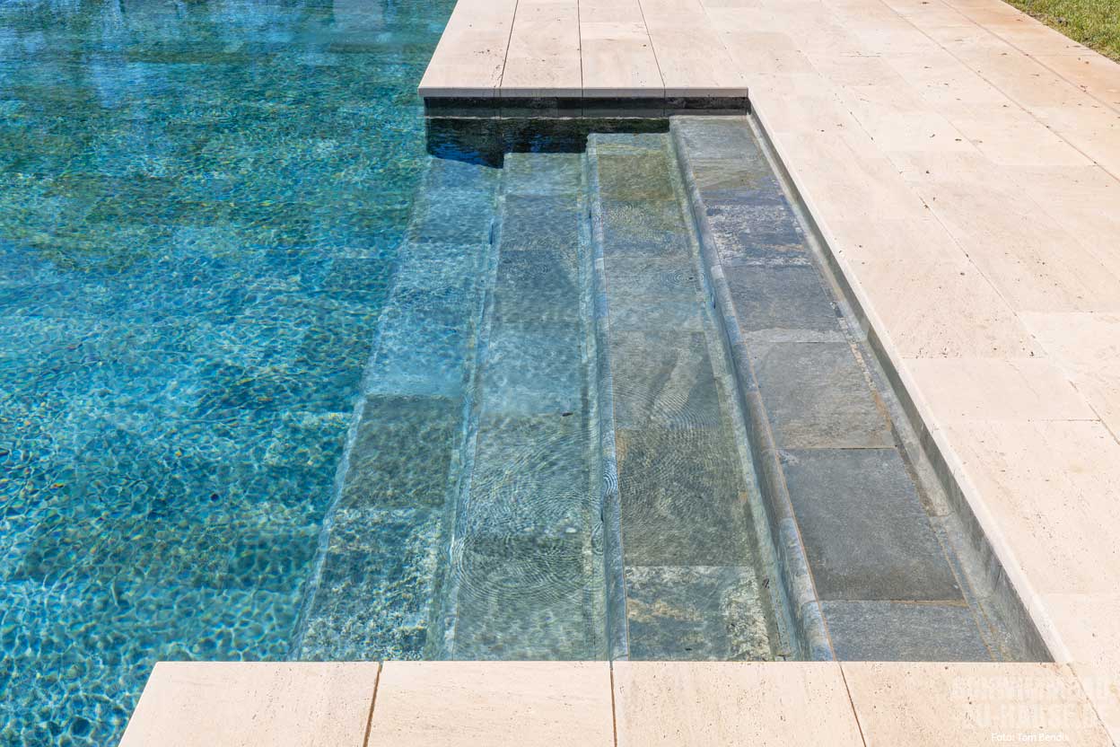 Das tieftürkis schimmernde Wasser 15 x 4,5 Meter großen des Pools strahlt in der Sonne, als ob es mit den Farben des Meeres konkurrieren würde. Sorgfältig ausgewählte großformatige Natursteinfliesen kleiden das rechteckige Becken aus und verleihen ihm eine zeitlose Eleganz. Ein minimalistischer Einstieg in der Mitte einer Längsseite unterstreicht das moderne und dennoch schlichte Design, das durch helle Terrassen-Fliesen ergänzt wird, die den mediterranen Charakter der Insel aufgreifen. Die Hanglage des