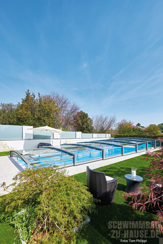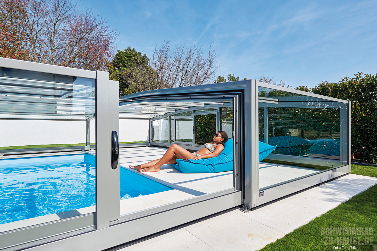 Einige Bauherren könnten zwar von Überdachungen zunächst abgeschreckt werden, da sie vermuten, die Ästhetik komme bei solchen Modellen zu kurz. Doch weit gefehlt: Überdachungen sind heutzutage äußerst stilvoll, wie das vorliegende Beispiel eindrucksvoll unter Beweis stellt, bei dem die Variante „Limone C XL“ von Paradiso verbaut wurde. Zudem wurde unter der Überdachung, die aus Echtglas gefertigt ist und damit als besonders kratzfest und langlebig gilt, eine Liegefläche zum Relaxen eingerichtet. Schwimmen und im eigenen Garten entspannen wird somit über viele Monate im Jahr möglich.