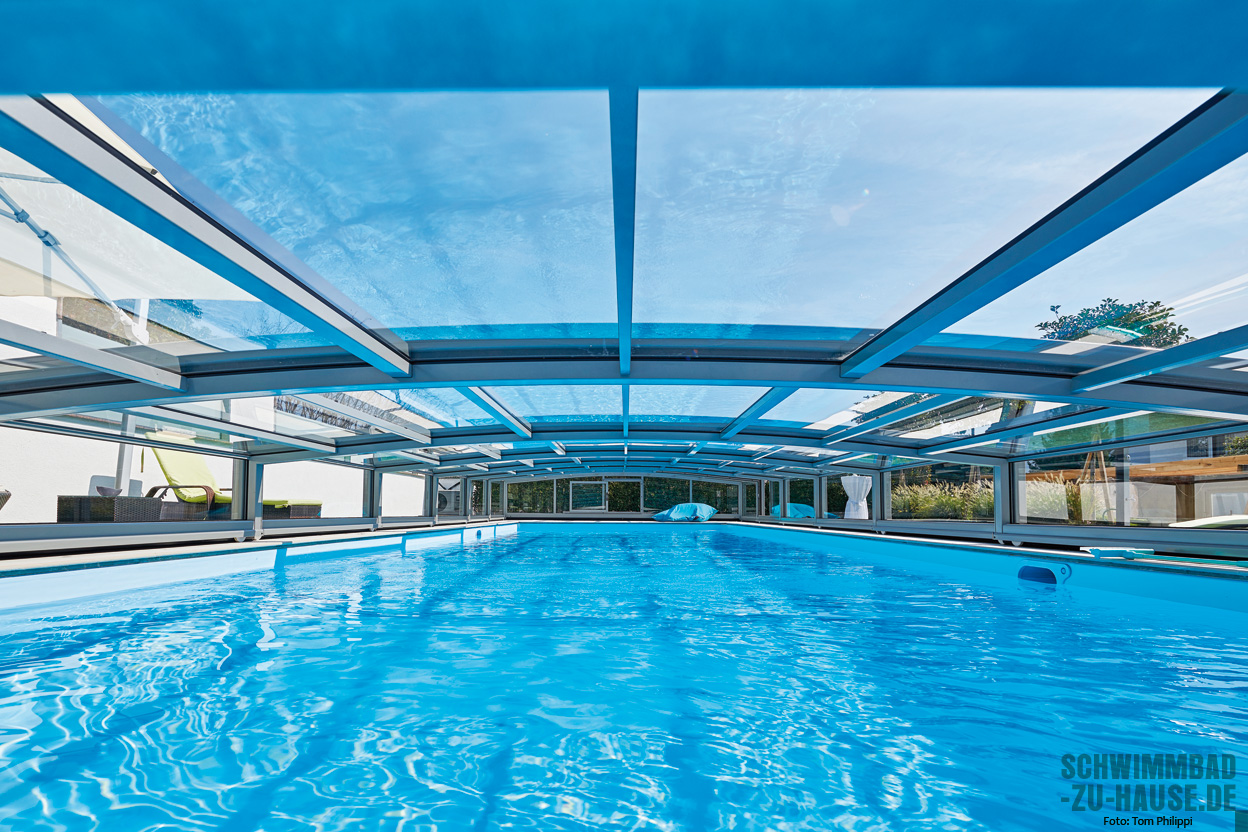 Die Bauherren wollten ihren Gartenpool möglichst über die gewöhnliche Badesaison hinaus nutzen. Auch, wenn es während der eigentlichen Saison mal regnen sollte oder die Witterungsbedingungen insgesamt nicht gerade zum Baden einladen, sollte das Schwimmen im Becken nicht nur möglich, sondern auch angenehm sein.