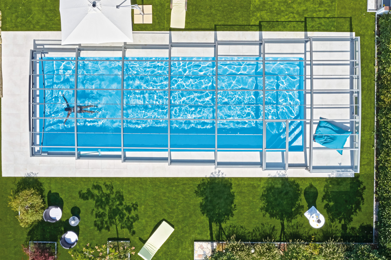 Das kristallklare Wasser des Beckens fällt einem bei diesem Vorzeigeprojekt als Erstes ins Auge. Damit dies auch einen so schönen und reinen Farbton behält und frei von Schmutz bleibt, haben sich die Bauherren für den Bau einer Schwimmbadüberdachung entschieden.