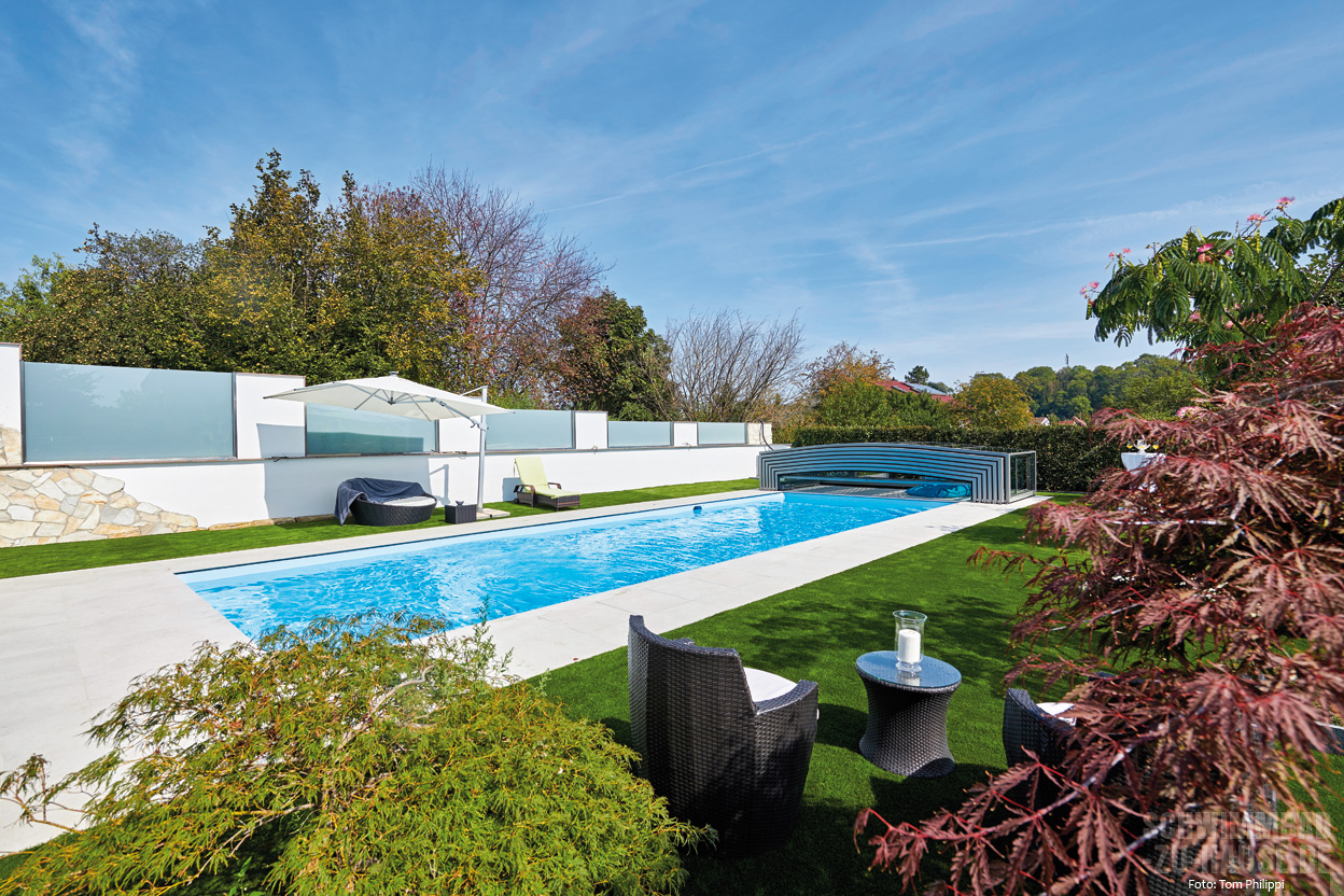 Wenn das Wetter gerade während des Sommers warm und sonnig ist, wird die Überdachung einfach teleskopisch ineinander gefahren, womit der Pool mitsamt Umgebung voll und ganz genossen werden kann. Und da bietet dieser Garten eine ganze Reihe Möglichkeiten.