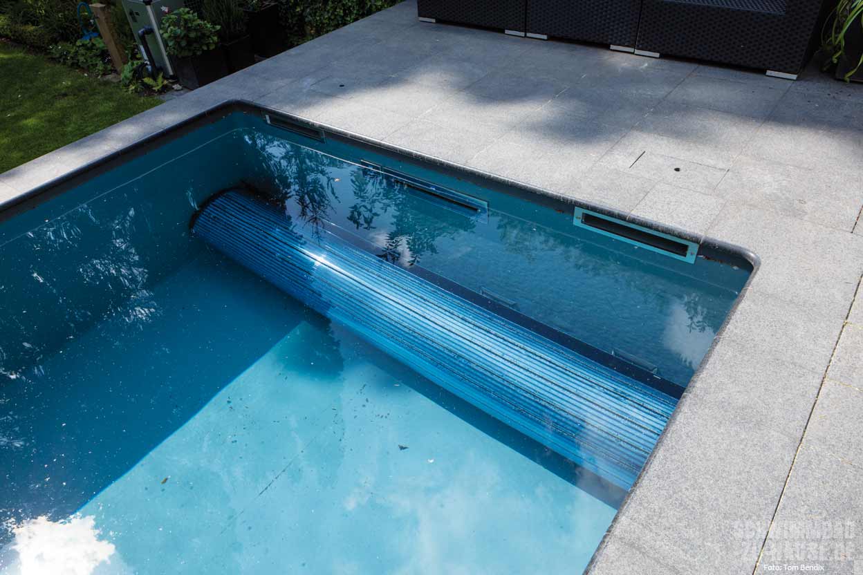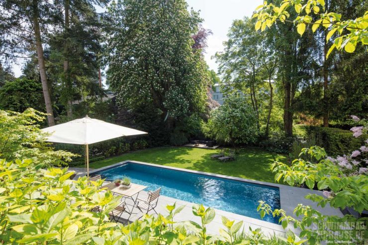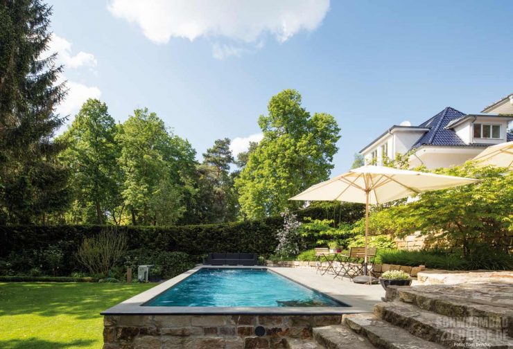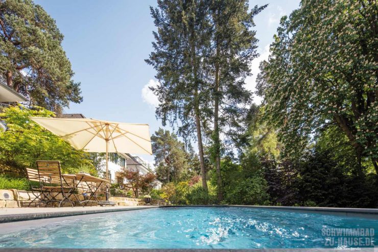 Probleme gleichzeitig lösen: Einerseits wird das Schwimmbad auf diese Weise harmonisch in das Gesamtbild eingegliedert. Zum anderen werden funktional getrennte und doch miteinander