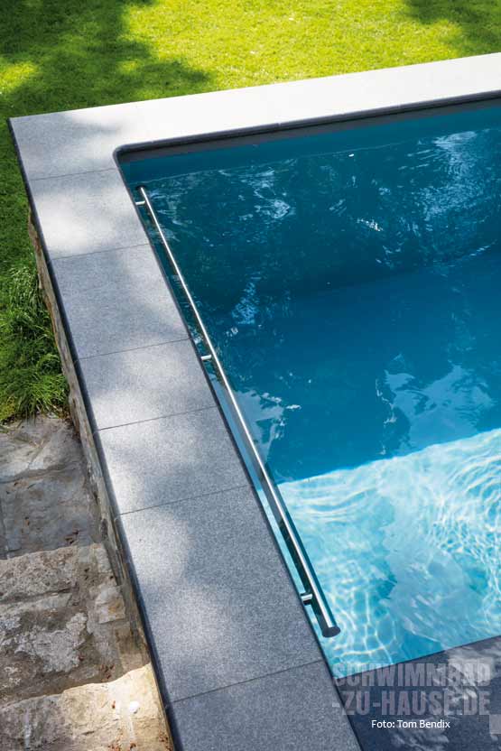 Allerdings hat die Umsetzung dieses Vorhabens sehr viel Mühe gekostet: In Handarbeit wurden etwa 80 Quadratmeter Boden für den späteren Pool freigeschaufelt und entfernt. Zusätzlich mussten Trockenmauern demontiert und zwischengelagert werden. Die größte Hürde stellte laut Rambow aber die Zerkleinerung der Sandsteine dar, die als natürlich wirkende Verblender für den Pool verwendet wurden. Dieser Vorgang verursachte enorm viel Staub. Deshalb musste sogar ein Zelt mit Absaugung aufgebaut werden. Gelohnt hat sich die Arbeit allemal, denn das Endergebnis ist ein modernes, vielseitig nutzbares Schwimmbad, das geschickt in den Garten eingefügt wurde.