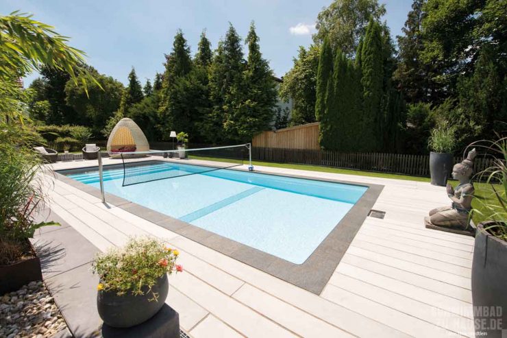 Klares hellblaues Wasser, eine modern geradlinige Beckenform und hochwertige Granitsteine in einem dunklen Farbton, die den Pool einrahmen und optisch in Szene setzen. Auf den ersten Blick wirkt dieser Familienpool in der Nähe von München wie ein klassisches Outdoor-Schwimmbad. Doch ein Detail ragt hier – im wahrsten Sinne des Wortes – heraus: ein quer über die Mitte des Beckens gespanntes Netz. Der außerhalb liegende Ball verrät, welche Sportart die Bauherren leidenschaftlich gern spielen: Wasservolleyball.