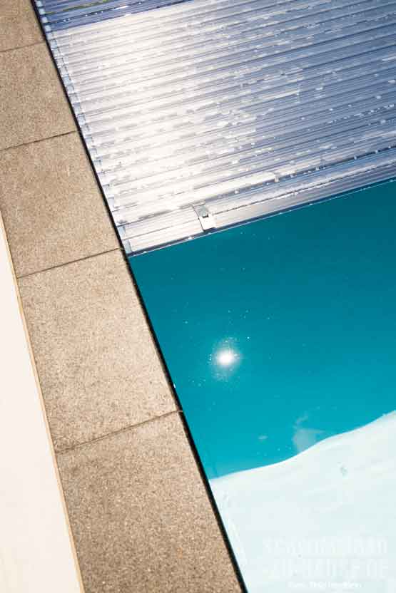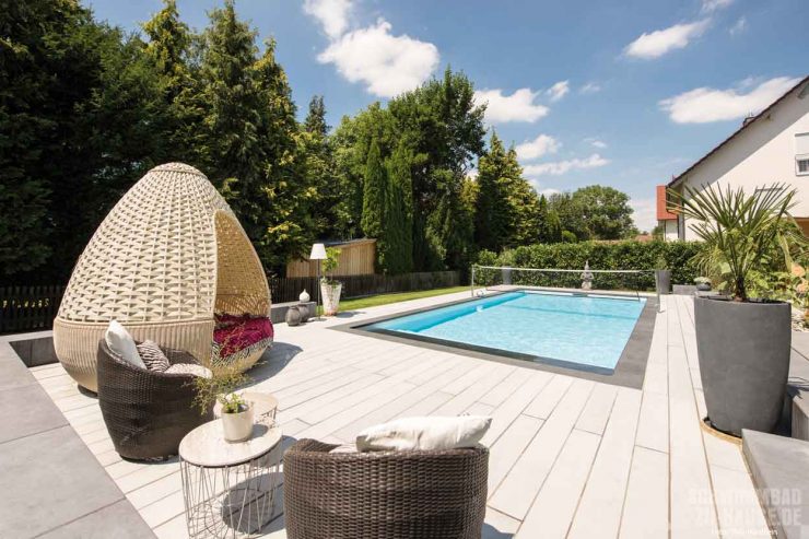 Doch auch in puncto Design und Ästhetik sollte bei diesem Pool alles stimmen. „Haus und Badeparadies sollten optisch miteinander harmonieren“, verrät der Bauherr. So präsentiert sich das Becken jetzt – genau wie das Wohnhaus – in dezent-gerader Form, während die Farbgestaltung auf einen Hell-dunkel-Kontrast setzt. Während die zeitlos-moderne Poolumrandung aus trendigen Nasensteinen sehr dunkel ist, entschied man sich bei den Terrassenfliesen für einen hellen Naturton. Durch den hohen Wasserstand, der auf einen Slim-Skimmer zurückzuführen ist, wird dieser Effekt zusätzlich verstärkt und Wasser, Becken sowie Umgebung scheinen so auf einer Ebenen zu liegen.