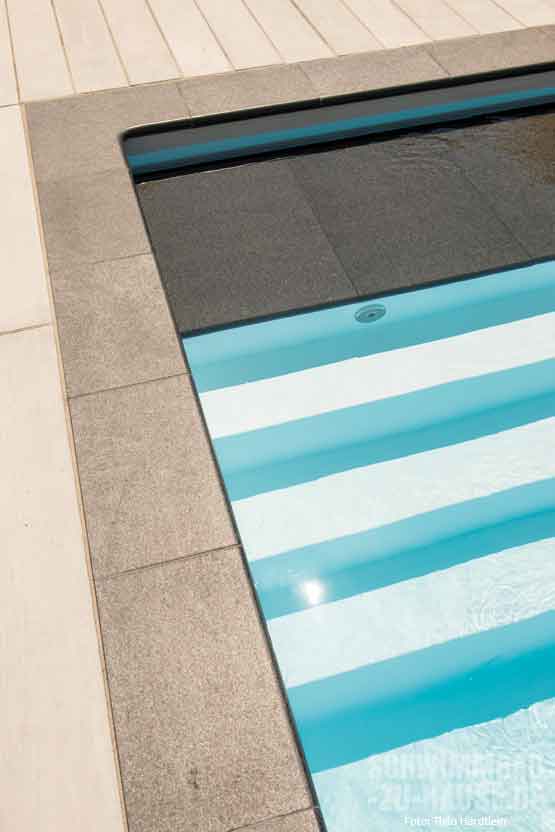 Last but not least: An der Stirnseite des Schwimmbades befindet sich der Flachwasserbereich samt Treppenbereich. Hier, auf der Granitabdeckung, können sich die Bauherren nach dem Volleyballspiel entspannen. Der Rollladenschacht ist übrigens dezent in die Treppenanlage integriert und wird ausgefahren, sobald der neue Traumpool nicht in Benutzung ist.