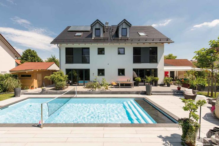 Schon immer wünschte sich diese Bauherren-Familie ein Haus mit Pool. Jetzt war es endlich so weit. Im Zuge des Neubaus fiel die Entscheidung für einen Outdoor-Pool im Garten hinter dem Haus. Der Clou: Neben Entspannung bietet das moderne Becken mit hochwertiger Schwimmbadtechnik einen hohen Freizeitfaktor: Der Pool ist kühles Nass und Spielfeld für Wasservolleyball zugleich.