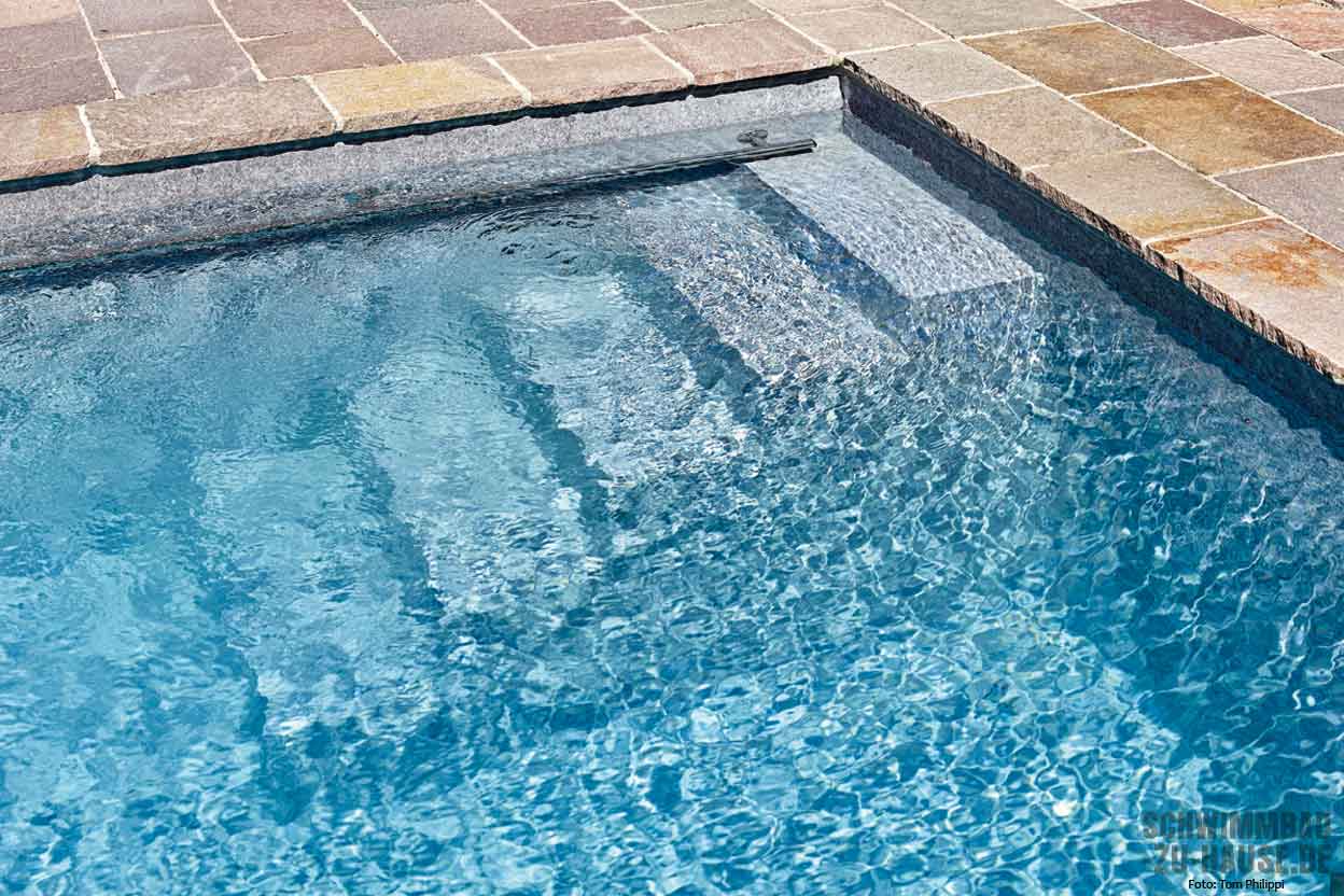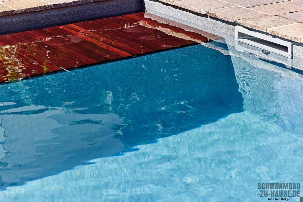 Durch das hoch gesteckte Ziel, den Pool so zu gestalten, dass er sich nahtlos in den Rest des Gartens einfügt, waren neben den Poolprofis und der Firma Renolit auch die kreativen Gartengestalter der Firma Grünwart beteiligt. Die Abstimmung aller Gewerke ist hierbei ein Schlüssel zum Erfolg und kann bei diesem Projekt zweifelsfrei als gelungen bezeichnet werden. Moderne Gartenmöbel runden in Einklang mit den vielen Pflanzen das Bild ab. Und trotzdem befindet sich das neue Highlight im Pool selbst: eine Unterwasserlounge aus Sipo Mahagoni. Auf circa zehn Zentimeter Wassertiefe wurde dieser besondere Wohlfühlort eingebaut und bietet einerseits eine hervorragende Entspannungsmöglichkeit für die Erwachsenen, während sich dort aber auch die Enkelkinder austoben können.