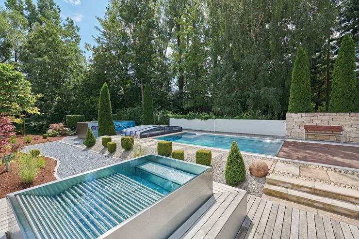 14 unterschiedliche Edelstahlpools in verschiedenen Größen und Ausstattungsvarianten präsentiert die Firma POLYTHERM in ihrem neuen Poolkompetenzzentrum in Weibern/Oberösterreich.
