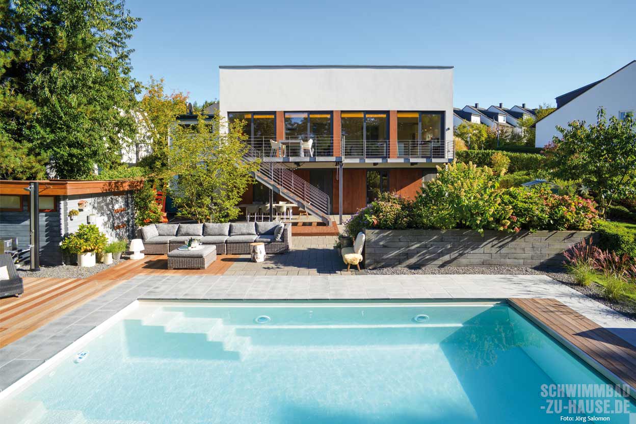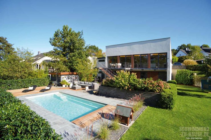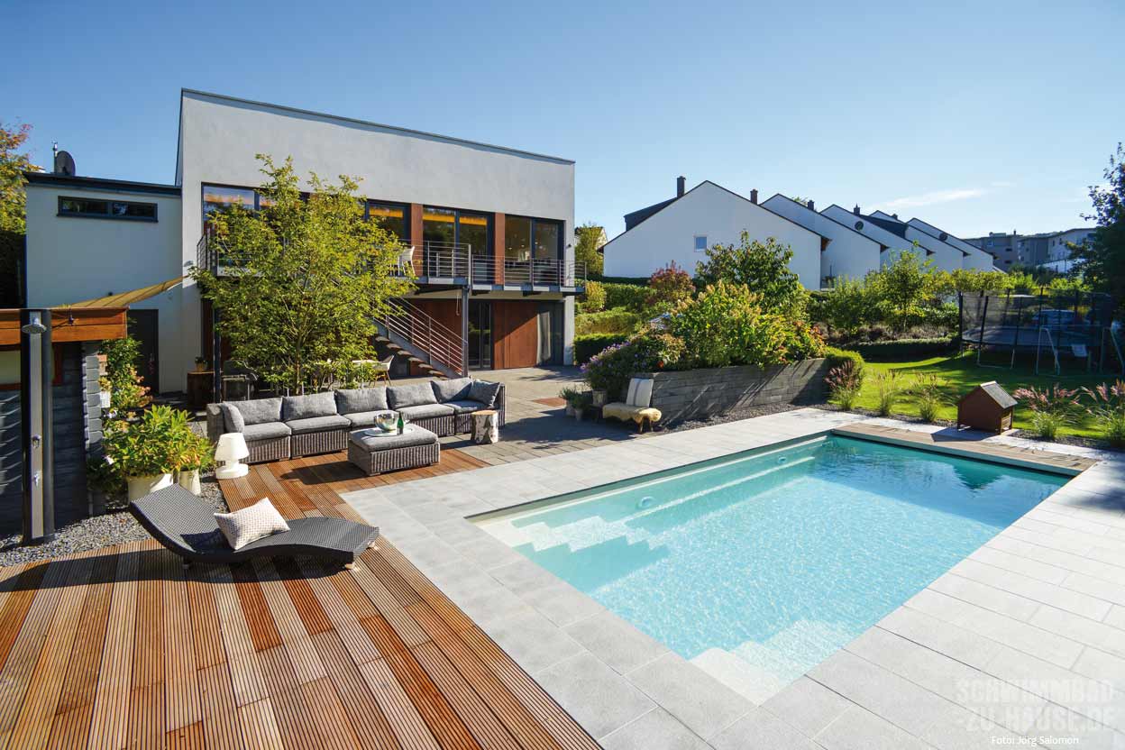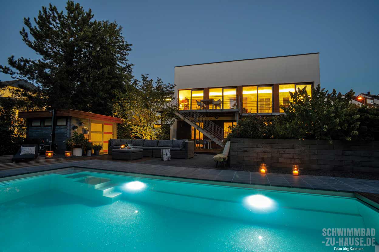 Auf dem gemeinsamen Transatlantikflug aus dem Urlaubsdomizil in Florida kam den erholten Bauherren die Idee, das Stahlmantelbecken im Garten durch einen hochwertigen Pool zu ersetzen. Direkt nach der Ankunft kümmerte sich die engagierte Hausherrin um die konkrete Planung des Bauvorhabens. Aufgrund der Tatsache, dass sie die Umsetzung erfahrenen Poolprofis überließ, konnte die Familie bereits vier Wochen nach Baubeginn die ersten Bahnen im neuen Schwimmbad ziehen.