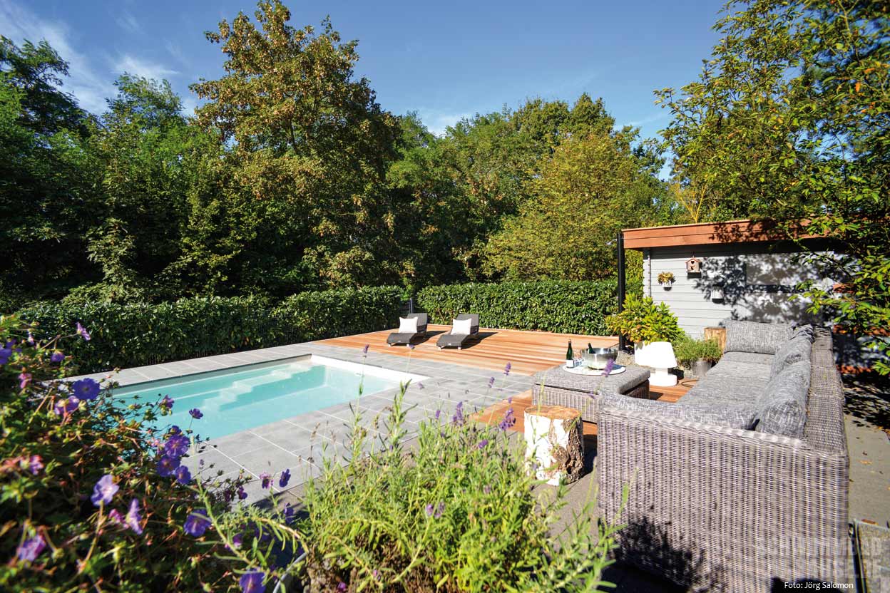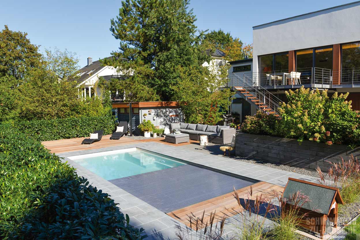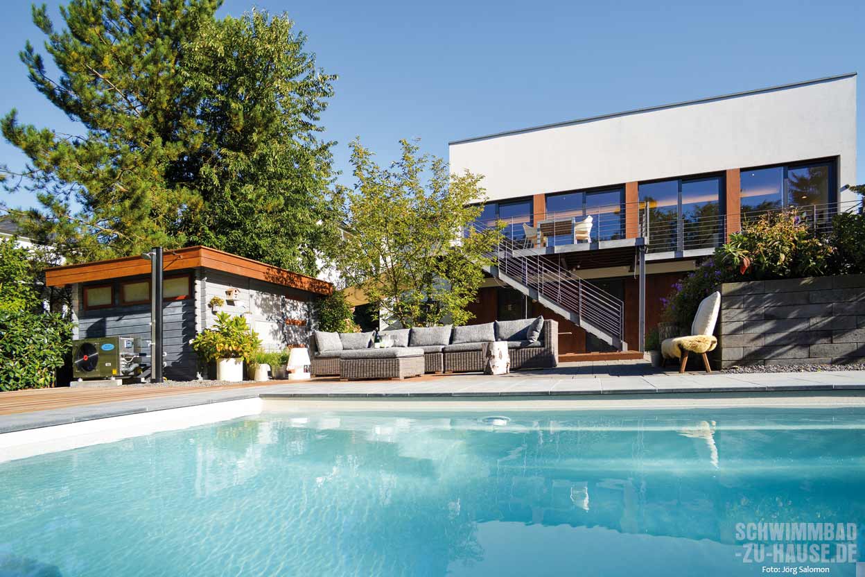 Auf dem gemeinsamen Transatlantikflug aus dem Urlaubsdomizil in Florida kam den erholten Bauherren die Idee, das Stahlmantelbecken im Garten durch einen hochwertigen Pool zu ersetzen. Direkt nach der Ankunft kümmerte sich die engagierte Hausherrin um die konkrete Planung des Bauvorhabens. Aufgrund der Tatsache, dass sie die Umsetzung erfahrenen Poolprofis überließ, konnte die Familie bereits vier Wochen nach Baubeginn die ersten Bahnen im neuen Schwimmbad ziehen.