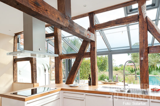 Der Lebensmittelpunkt der Familie ist der Wintergarten. Über die offene Außenwand des Hauses ist der gläserne Anbau heute nach Süden hin übergangslos mit dem Wohnhaus verbunden. „Die Idee, einen Wintergarten als Lebensmittelpunkt anzubauen, war für uns von vornherein gesetzt. Wir hatten vorher bereits mit einem Wintergarten gelebt und da kann man einfach nicht mehr ohne. Den zusätzlichen Wohnraum, den Lichtgewinn und die Lebensqualität wollten wir in jedem Fall erhalten“, erklärt Klaus Herold. Die Entscheidung fiel auf ein System von Solarlux, eine Kombination aus Wintergarten-Dachsystem „SDL Nobiles“ in Pultdach-Ausführung und der flexiblen Glas-Faltwand „SL 80“ als senkrechte Verglasung. Neben der Eleganz des Wintergartens überzeugen das Ehepaar auch die Dämmwerte des Systems: „Wir haben extrem viel Wert auf gute Wärmedämmung gelegt. Uns war es wichtig, dass wir den Wintergarten jederzeit nutzen können. Bei Minusgraden ebenso wie bei plus 30 Grad Celsius“, so Klaus Herold. Um die Einheit von Wohnraum und Wintergarten möglichst energieeffizient beheizen zu können, wurde eine Fußbodenheizung in den Glasanbau integriert. Zwei an das Haus anschließende seitliche Stellwände aus Lehm wurden außerdem – ebenso wie die Wände des gesamten Wohnhauses – mit einer Wandheizung versehen. Betrieben wird das System mit Hackschnitzeln aus der Tischlerei. Der Aufwand hat sich gelohnt: „Wir haben praktisch keine kalten Punkte im Haus und die Wärmeeffizienz ist sehr gut. Das Gebäude ist darüber hinaus quasi CO2-neutral“, resümiert der Bauherr.