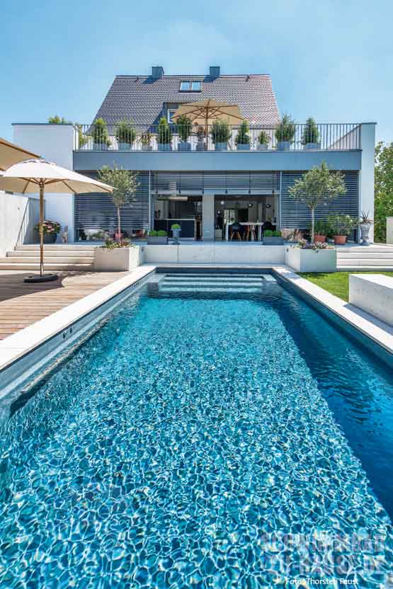 Dass möglichst viel Zeit für das Genießen des neuen Pools zur Verfügung steht, garantiert hochwertigste Schwimmbadtechnik. Der Salzwasserpool verfügt über ein professionell aufeinander abgestimmtes Ensemble aus Pumpen, Filteranlage, Poolsteuerung und Wärmetauscher, die kristallklares Wasser liefern. Die Bauherren müssen so lediglich 30 Minuten pro Woche für die Poolpflege investieren. So bleibt mehr Zeit im Jahr zum Schwimmen. Denn auch im Winter bleibt die neue Wellness-Oase in Betrieb. Dann dient sie nicht selten zum Abkühlen nach der Sauna.