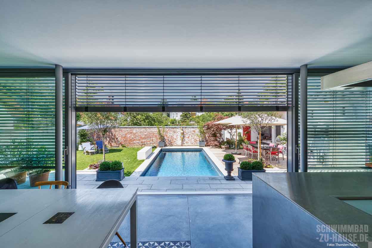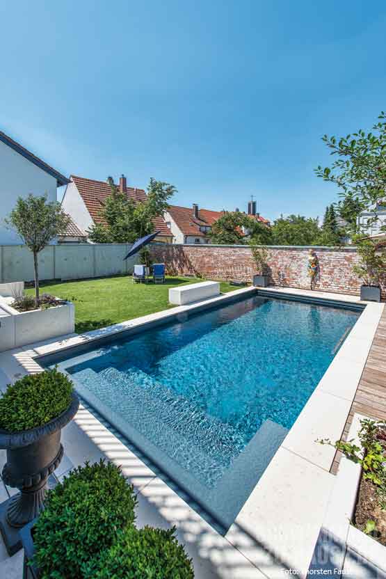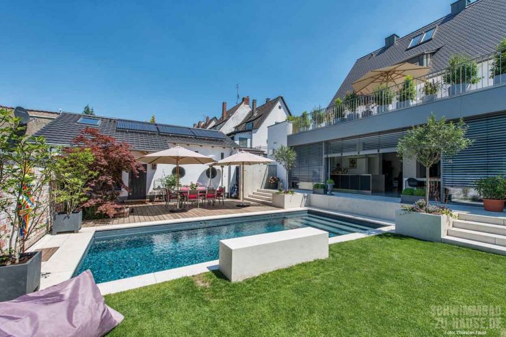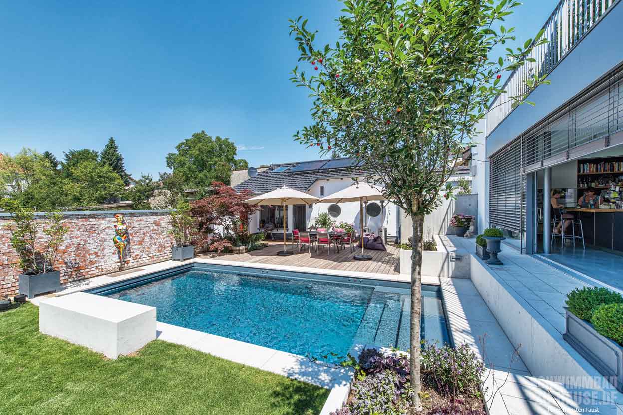 Apropos Schwimmbadprofis: Die Bauherren wussten, dass ein erfahrener und zuverlässiger Poolbauer essenziell für das Gelingen ihres geplanten Projekts im Garten ist. Da das Ehepaar bereits exzellente Erfahrungen mit dem Team von Pool-Konzept aus dem nahe gelegenen Haibach gemacht hatte, beauftragten sie auch jetzt wieder die Fachleute mit der Planung und Umsetzung. „Besonders spannend bei diesem Auftrag waren die Gegebenheiten der Umgebung. Die Nähe des Pools zum Wohnbereich verbindet innen und außen. Gleichzeitig war diese Nähe auch eine Herausforderung, da die engen Platzverhältnisse beim Bau kreatives Geschick verlangten“, erinnert sich Schwimmbadbauer Thorsten Stab, Geschäftsführer bei Pool-Konzept.