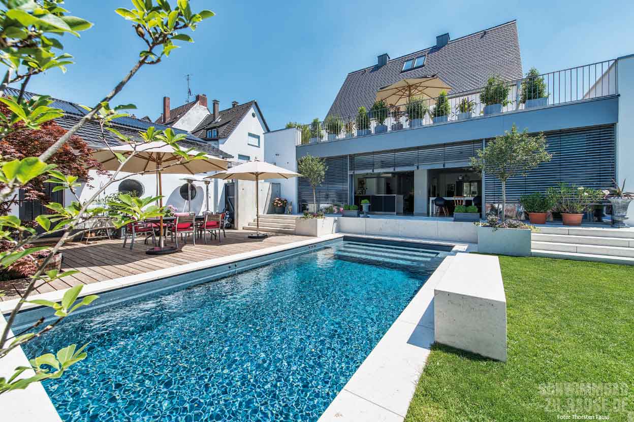 Steigerung der Lebensqualität – dies ist eines der wichtigsten Parameter in der heutigen Zeit. In diesem Kontext spielt das eigene Zuhause, der Ort der Ruhe, eine besondere Rolle. Hier, in den eigenen vier Wänden und im privaten Garten erholen wir uns von dem stressigen Arbeitsalltag. Hier soll alles genauso sein, wie wir es mögen. Maßgeblich zur Steigerung der Lebensqualität gehörten für die Bauherren dieses privaten Pools zwei Aspekte: Fitness und Wellness. Deshalb stand es außer Frage, im Rahmen der Sanierung ihres Wohnhauses aus dem Jahr 1954 auch zugleich das in die Jahre gekommene Schwimmbad im Garten zu modernisieren. Da das alte Becken aus Sichtbeton viel Zeit für die Pflege in Anspruch genommen hat, sollte im neuen Pool großer Wert auf eine moderne, zuverlässige Schwimmbadtechnik gesetzt werden. „Wir wünschten uns einen Pool, der Fitness und Wellness gleichermaßen bedient. Mit der Kombination aus Gegenstrom- und Massageanlage setzten die Schwimmbadprofis diesen Wunsch erstklassig um“, erläutert der als Ingenieur tätige Bauherr.